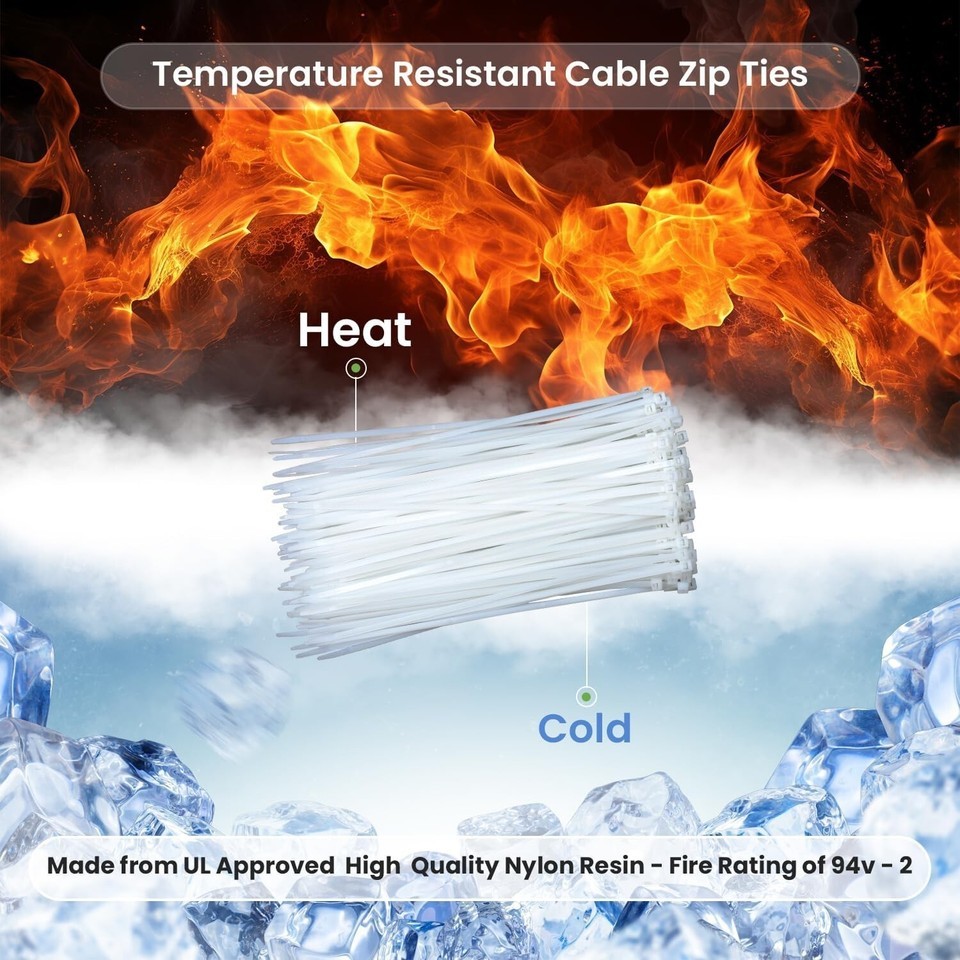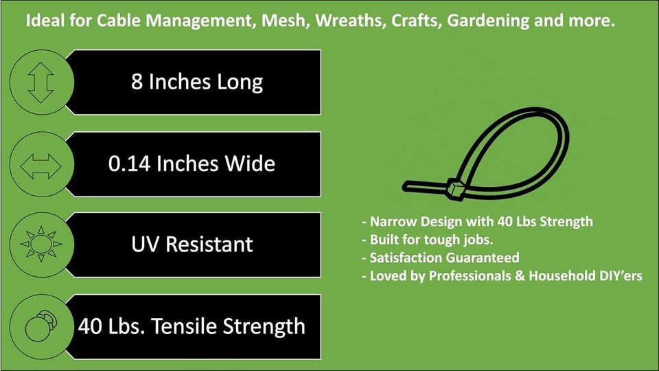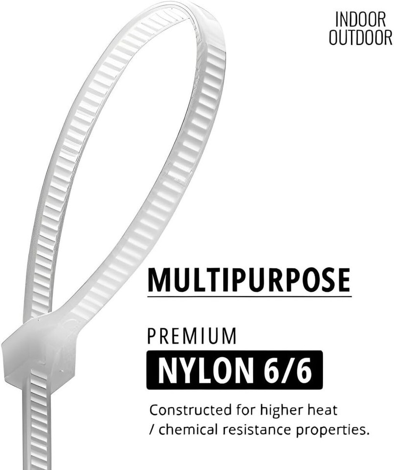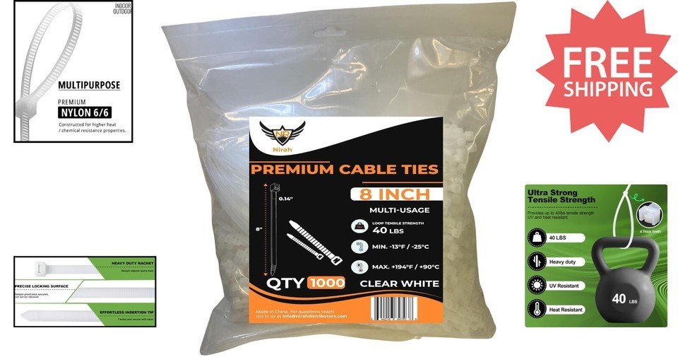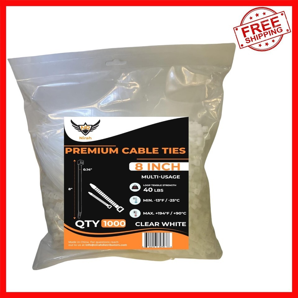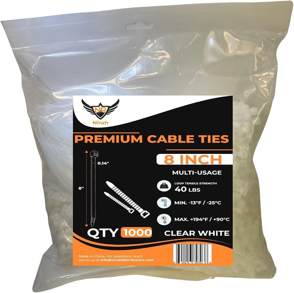 Discover the Nirah 1000 Pack of Heavy Duty Cable Ties ? the ultimate solution for all your indoor and outdoor fastening needs. Made from UV stabilized nylon 6/6, these self-locking zip ties are built to last, with a tensile strength of 40 pounds and a working temperature range from -40? to 185?. Each tie measures 8 inches in length, 0.14 inches wide, and is suitable for applications up to 2 inches in diameter. Versatile and durable, they?re perfect for wreath making, home projects, garden, shed, garage organization, and electrical work. As part of North America?s largest cable tie collection, Nirah delivers high-performance, high-quality zip ties at a fair price. Experience the Nirah difference today! To ensure fast and reliable delivery, we work with multiple fulfillment partners and suppliers. Depending on availability and location, your order may ship from different warehouses or arrive in packaging that varies from item to item. Tracking details are typically provided shortly after shipment, and customer satisfaction remains our top priority. Please note that due to carrier policies and regional regulations, certain items may not be eligible for delivery to specific states or territories.