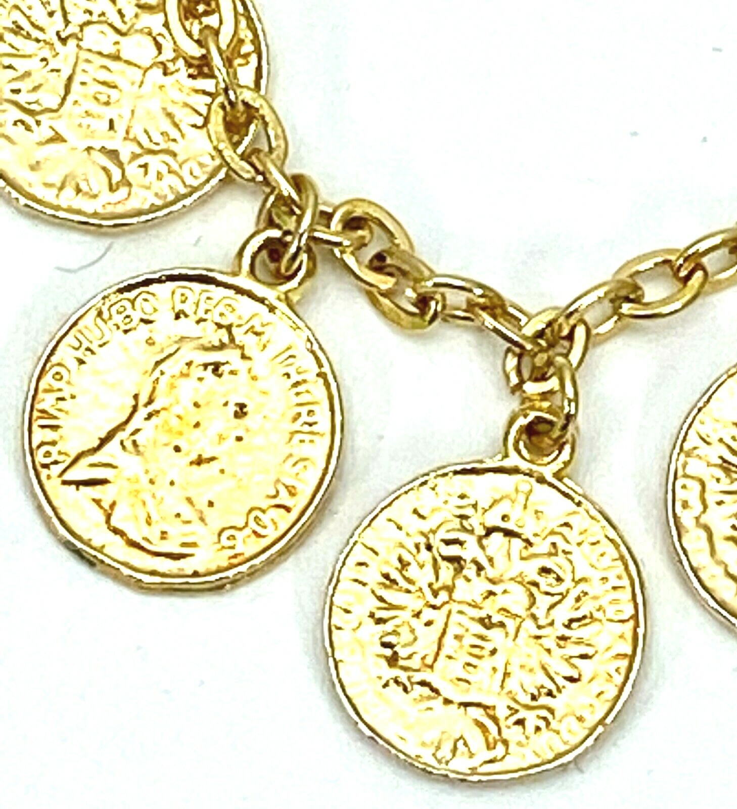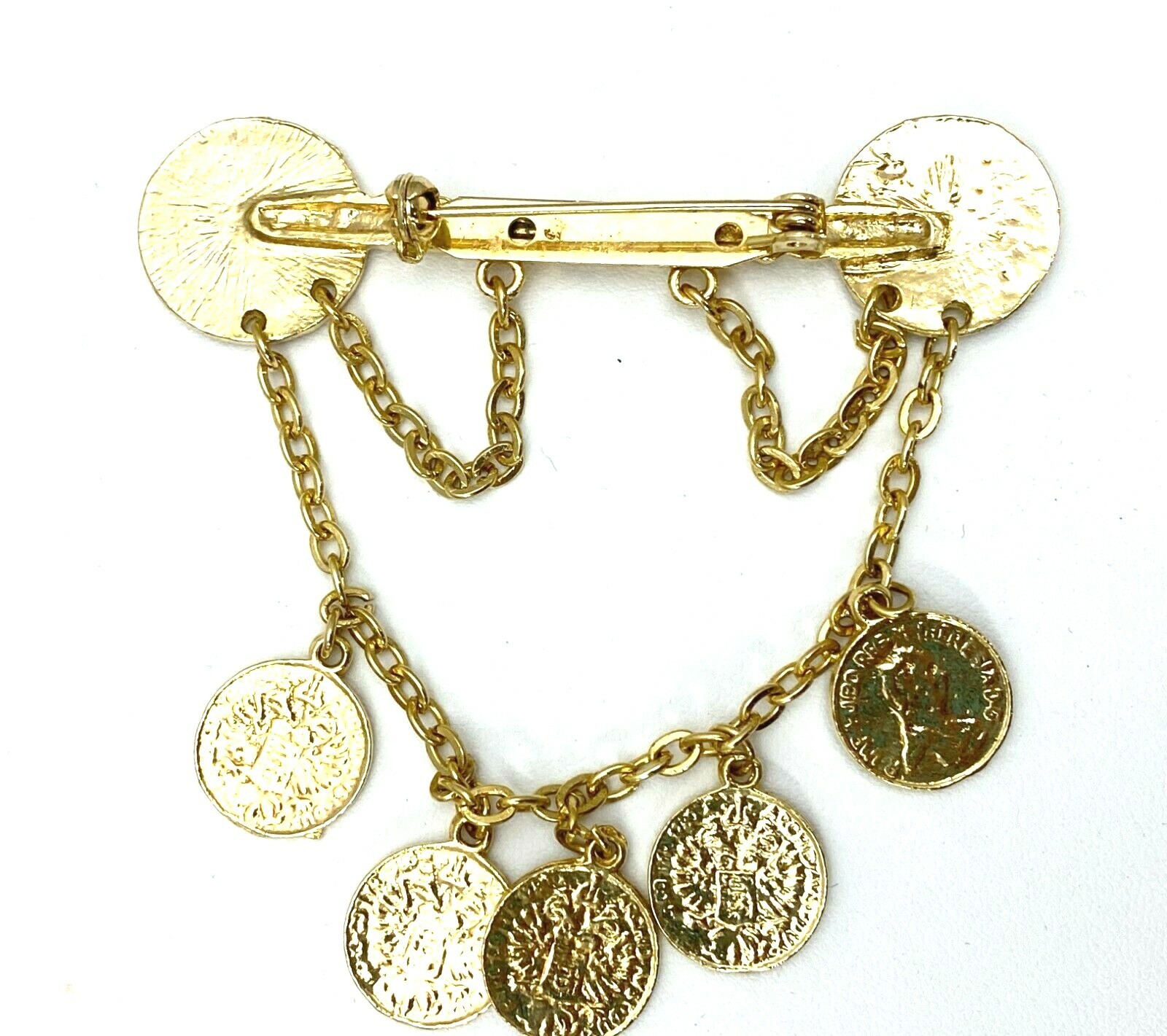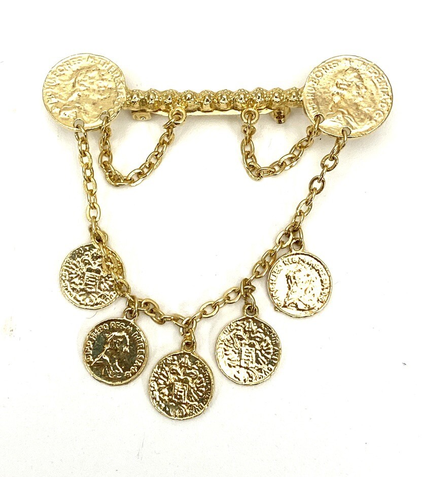 VINTAGE DANGLING COINS GOLD TONE Estate BROOCH Bar PIN 1960s 3"- in perfect, shiny condition, unsigned. It's quite heavy and well made.