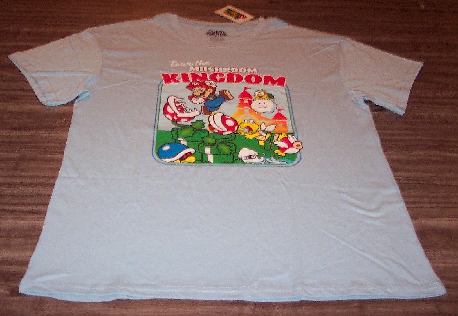 This is a Vintage Style SUPER MARIO BROS. "Tour The Mushroom Kingdom" NES Nintendo Video Game T-shirt. It is a size LARGE and it is NEW with the tag. It is 23 inches from armpit to armpit and 30 inches in length. Combine auctions to save on shipping. ADD2