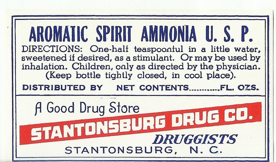 Vintage Pharmacy Label AROMATILC SPIRIT AMMONIA U.S.P. Statonsburg Drug Co N.C.
