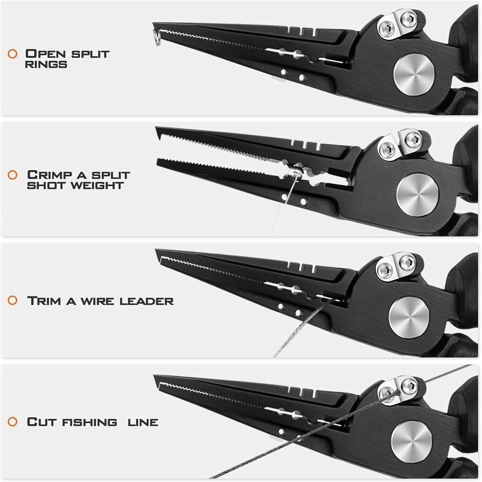 Features: Lightweight,Highly Corrosion Resistant,Tungsten Carbide Cutters,Non-Slip Grip,Crimping Slots,Bait Tuning Slots,Integrated Wire Cutter,Spring Loaded Jaws,Custom Molded Sheath,Belt Clip,Coiled Lanyard