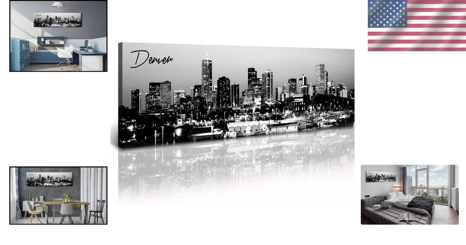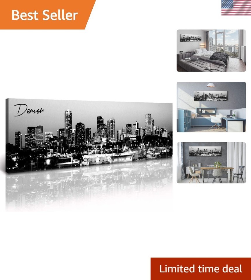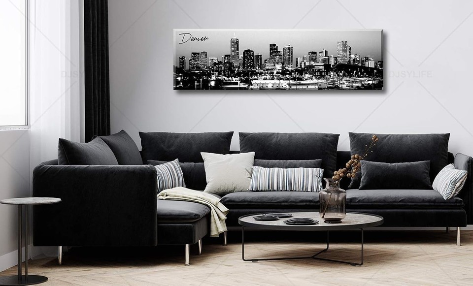 Chic Framed Black and White Wall Art - Denver Skyline Canvas Print 47.3”x13.8”