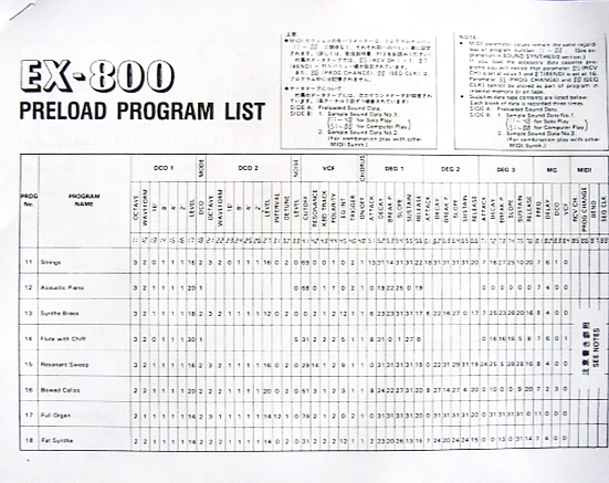 Preload Program List Sheets for Korg EX-800 Polyphonic Synthesizer Midi Module