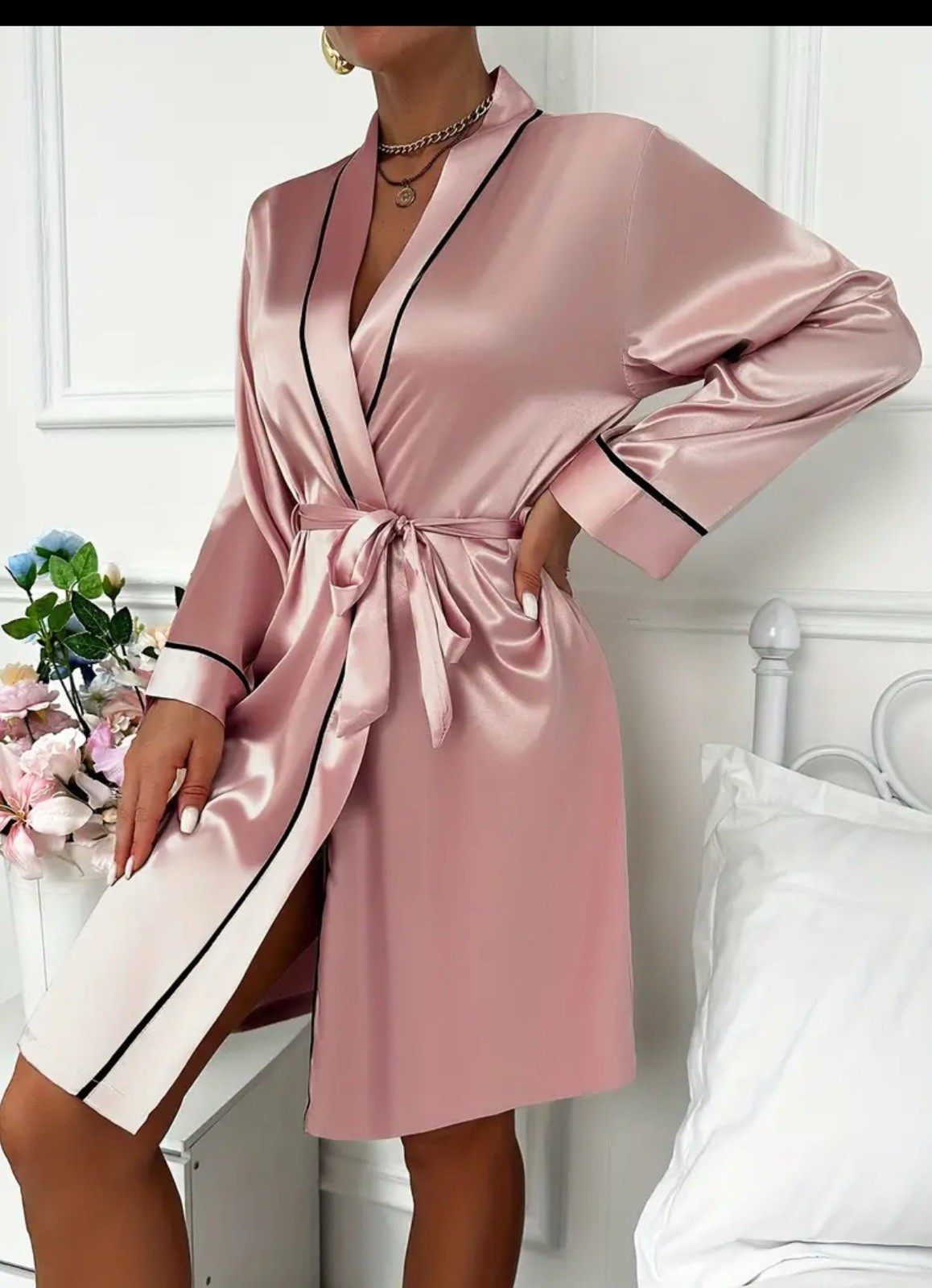 This pink silky tie robe is a stylish and elegant addition to any woman's wardrobe. Made from 100% nylon with a satin fabric type, this long-sleeve robe features a round neck, adjustable straps, and a belted closure for a flattering fit. Perfect for all seasons, this lightweight robe adds a touch of designer allure to your loungewear collection. Whether for sleeping or lounging, this robe is a must-have for women looking for a sexy and comfortable option.