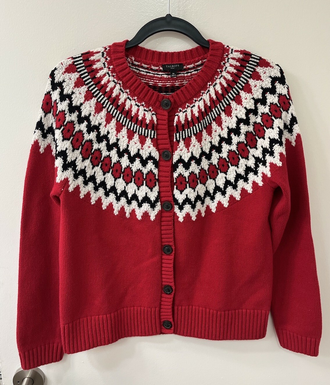 Talbots Sweater Womens Medium Petite Fair Isle Knit Cardigan red white black