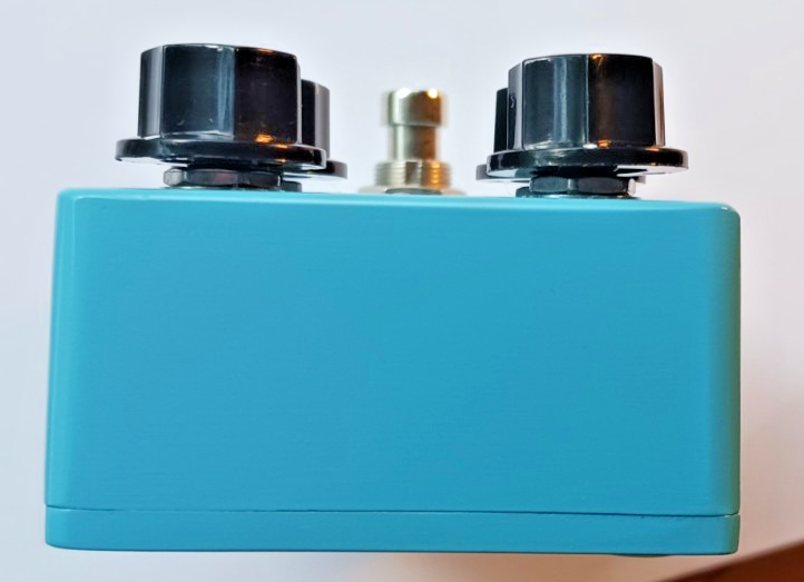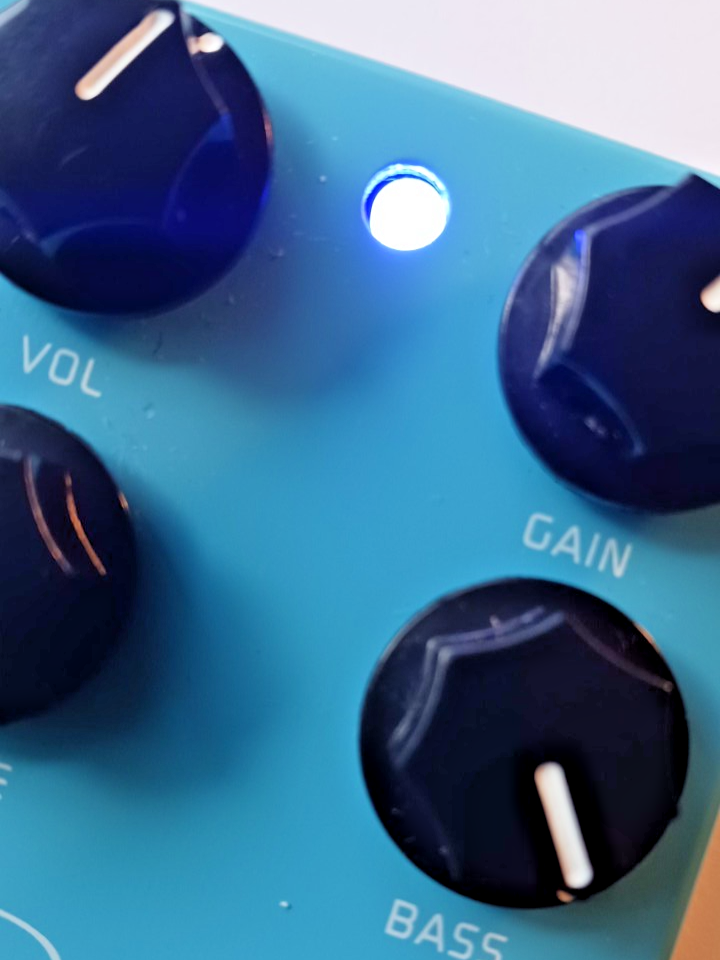 This pedal has Volume, Gain, Treble and Bass dials, an LED light, 1/4" in and 1/4" out jacks, a 9V adapter input, a true bypass switch to turn it on and off, all in a sturdy metal case.