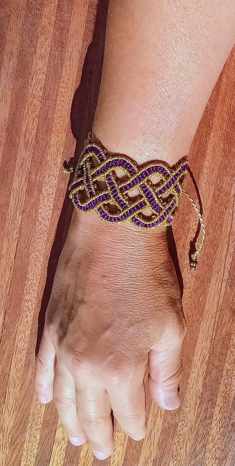 Thick cuff macrame bracelet made with purple and metallic gold threads. It has 2 metal beads on the ends and the width adjusts from 6 inches to 10 inches.