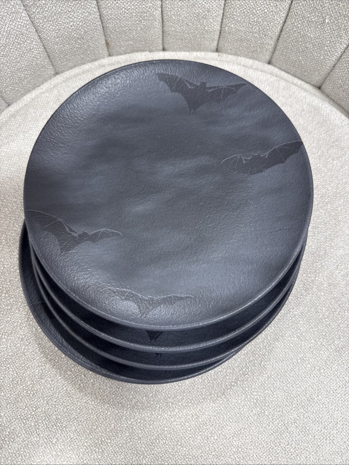 (4) Mesa Brasil Halloween Black Bat Salad Plates ~ New ~