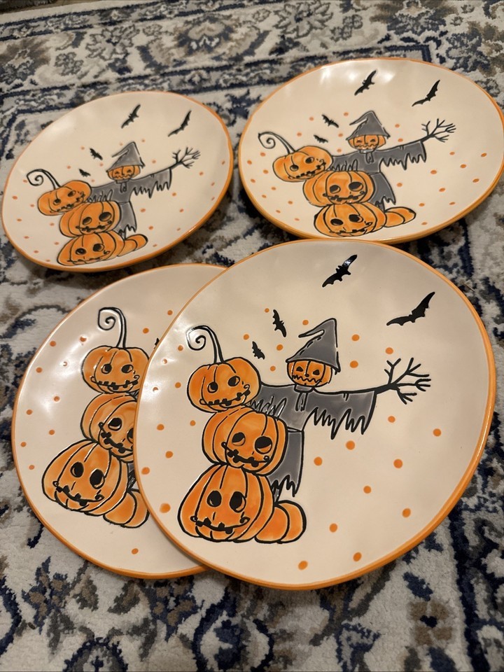 Eli Ana Happy Halloween Bat Pumpkin Scarecrow Salad Plates S/4 ~ New~