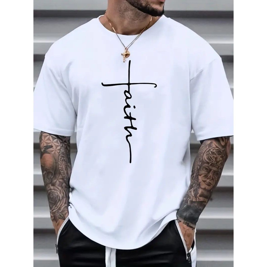Faith written in cursive intersecting with cross Men's 4XL casual tee shirt - White