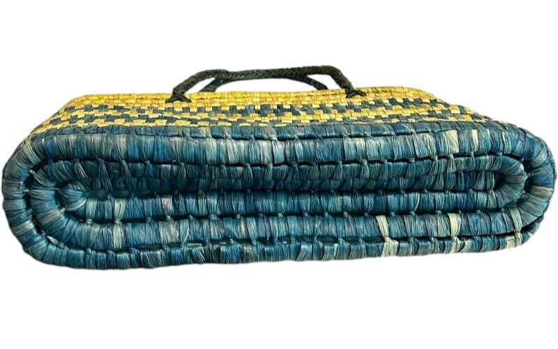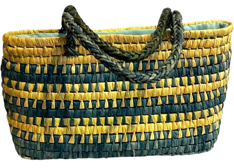 cotton lined straw tote bag beige & blue 17 x 10 x 4 inches