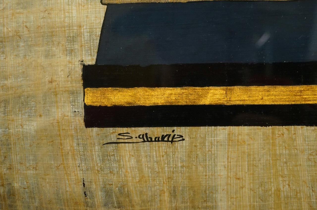 Egyptian Papyrus Original Art Painting King Ramses II Goddess Hathor Nefertari. Making an offering of lotus flowers. 25" by 21.5" - bright colors, gold accents. Simple metal frame.