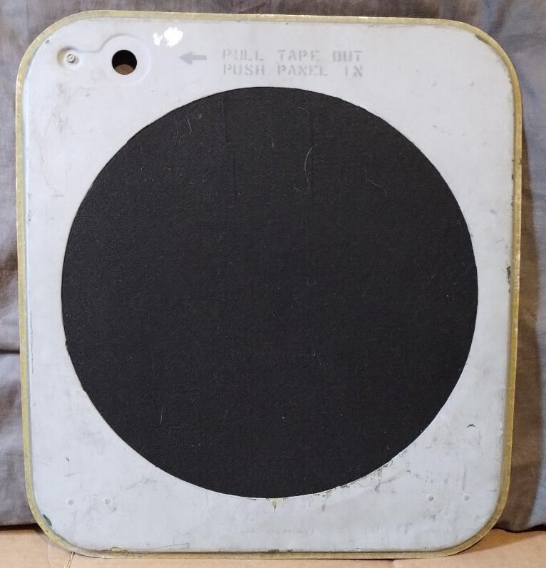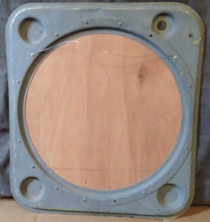 Something you don't see every day is this helicopter escape hatch which has a fabric covered piece of plywood mounted on the back to fill the hole, and there is picture hanging wire secured to it so all you need is a spot for it on your own wall. Provided you have the same use in mind; I thought it might work well on a kid's play house. About 24" wide by 27" high. Painted a dull gray which makes me think it was naval in origin. Looks similar to that used on a Chinook, judging from a photo I found online. Might have been interior, for exiting the cockpit, I really don't know for sure. Would make a first rate backdrop for a Desert Storm display.