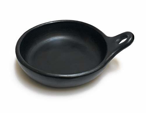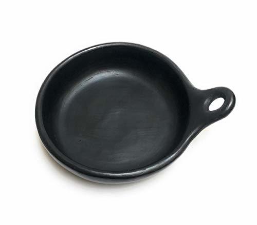Bullet point: Multi-Purpose Saute Pan: Our black clay saute pan is designed for both cooking and serving meals. This versatile cookware is perfect for roasting vegetables, pan-frying seafood, and preparing omelets. It features an elegant small handle for easy handling and storage. We recommend using a heat diffuser when using Chamba cookware on non-gas stoves.