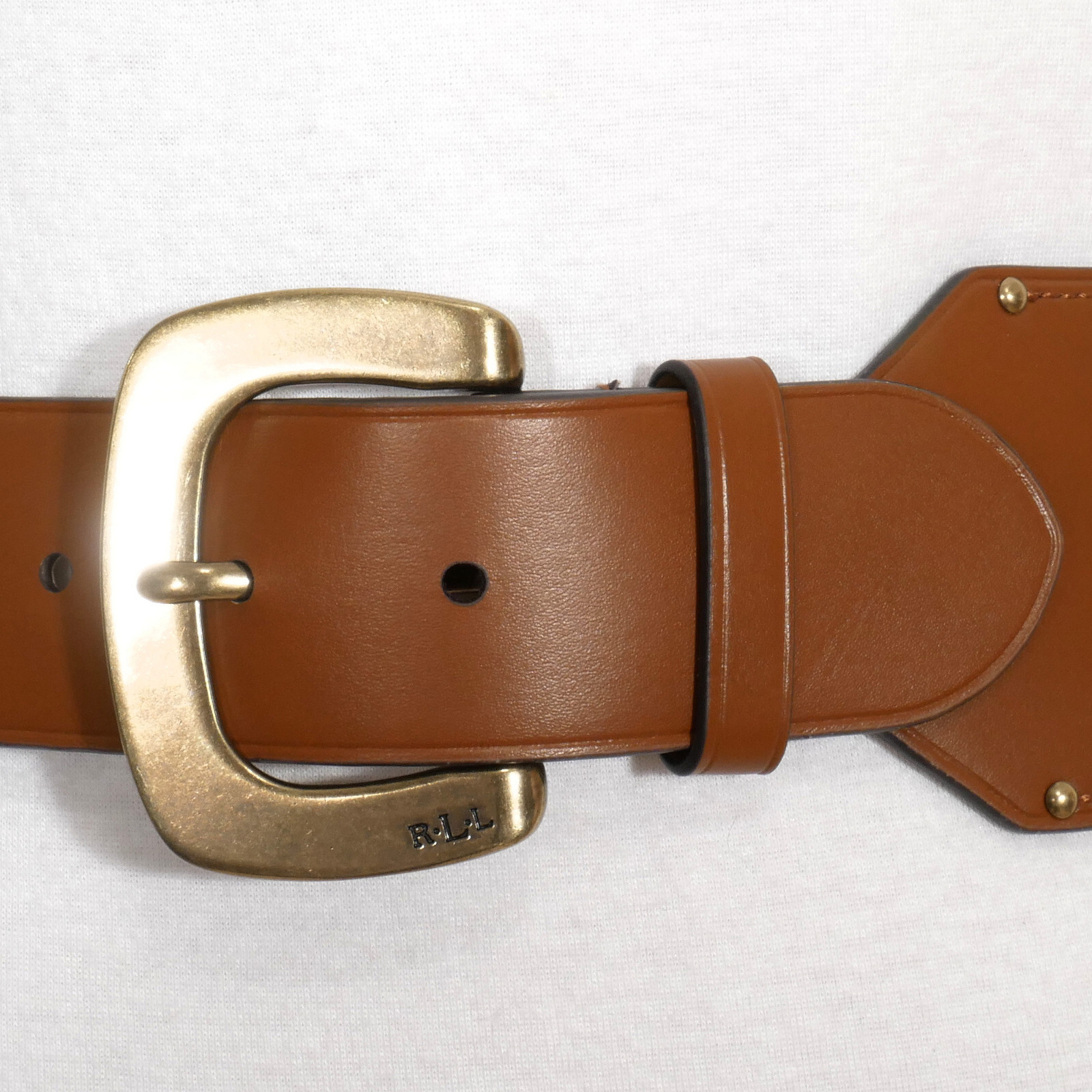 Brown faux leather ends with stamped LRL logo, brushed bronze centerbar buckle embossed
