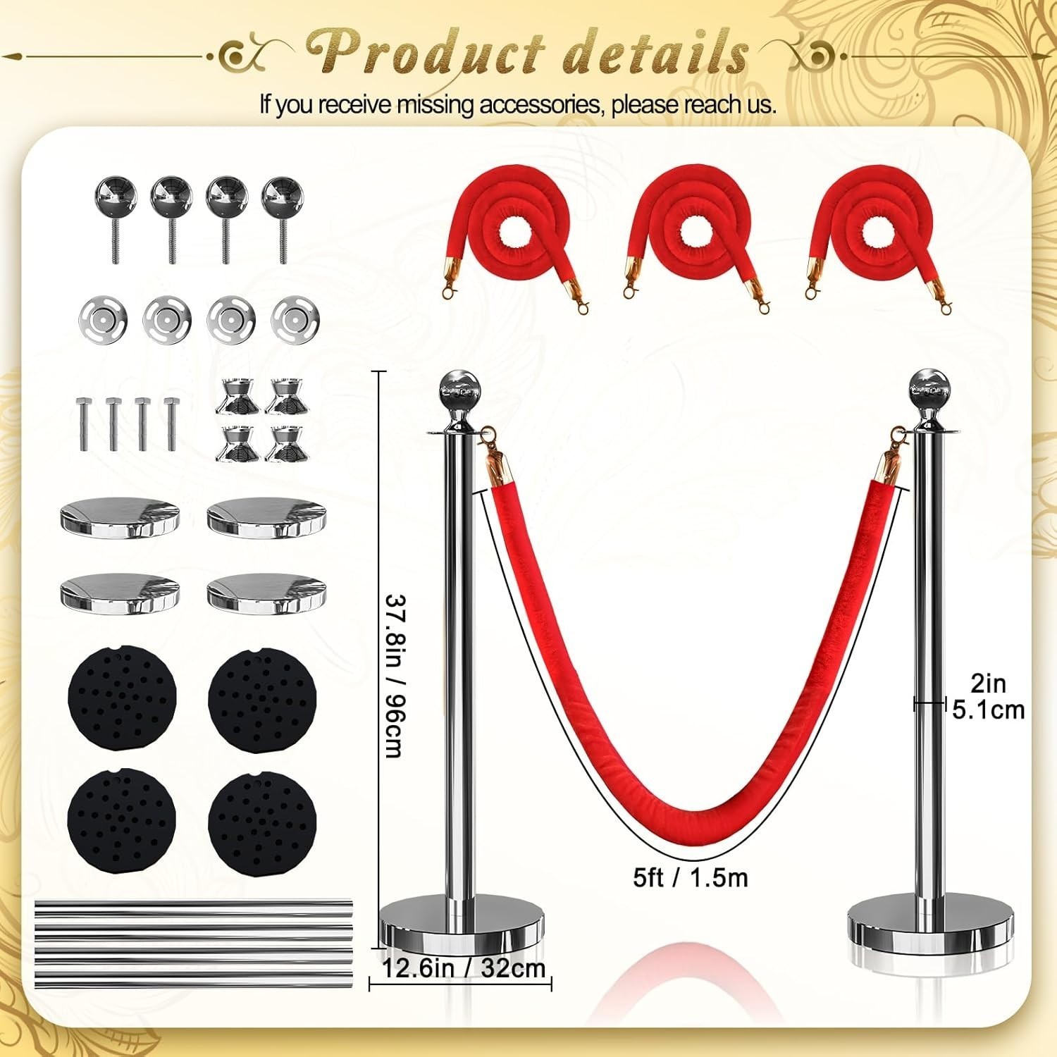 You will get: 4*Stanchions(37.4 in), 3*Ropes(5 feet/ 1.5 meters) with zinc alloy lobster clasps, stanchions and velvet ropes come in customised packaging to reduce the risk of product breakage and missing accessories, and All the things will be delivered at the same time, it will not delay your use.