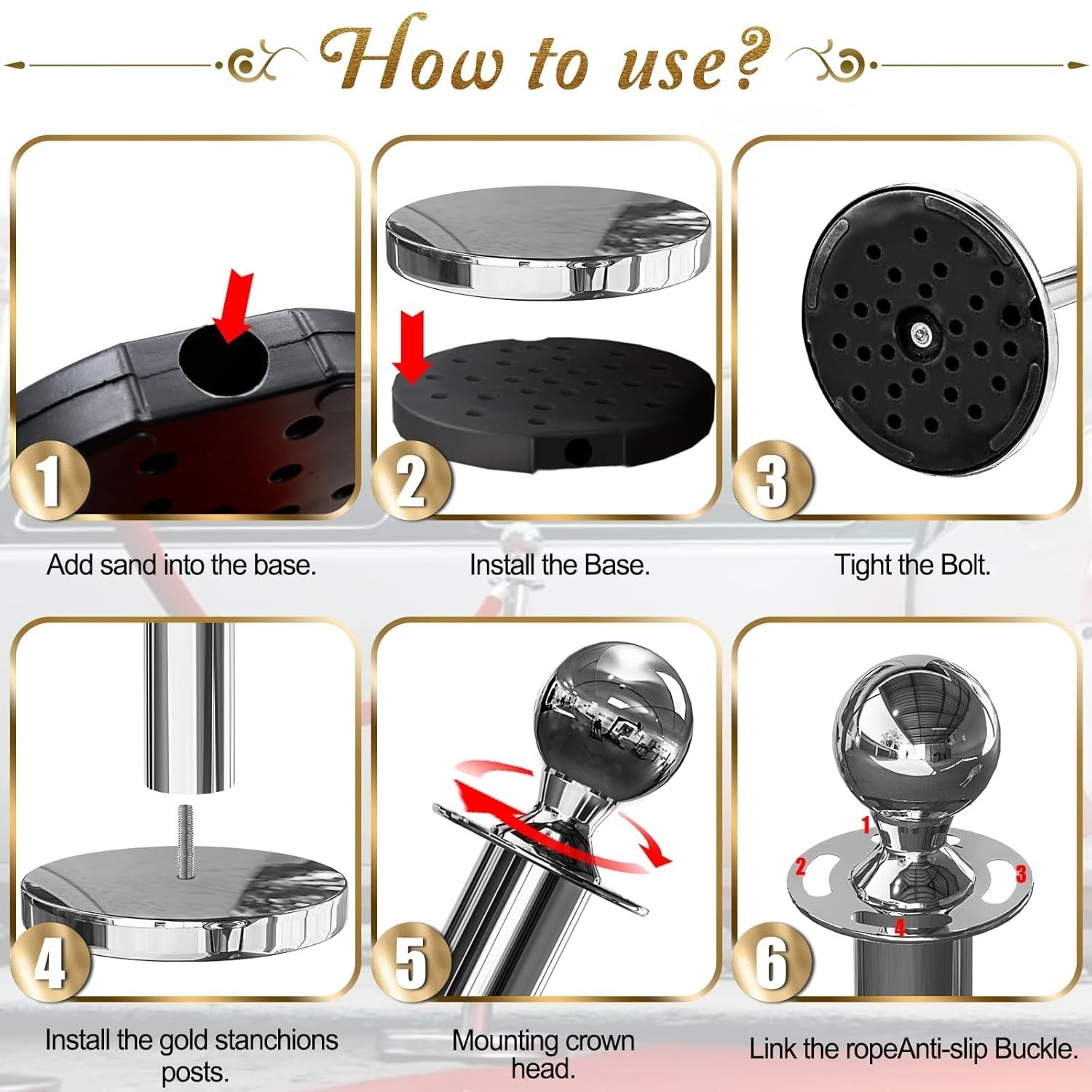 Easy to Install: You can quickly and easily assemble stanchion post without any additional tools, Each post effortlessly screws into place, ensuring a hassle-free setup process, and each post has 4 adapters on top for attaching velvet ropes, and there are hooks at the ends of each rope.