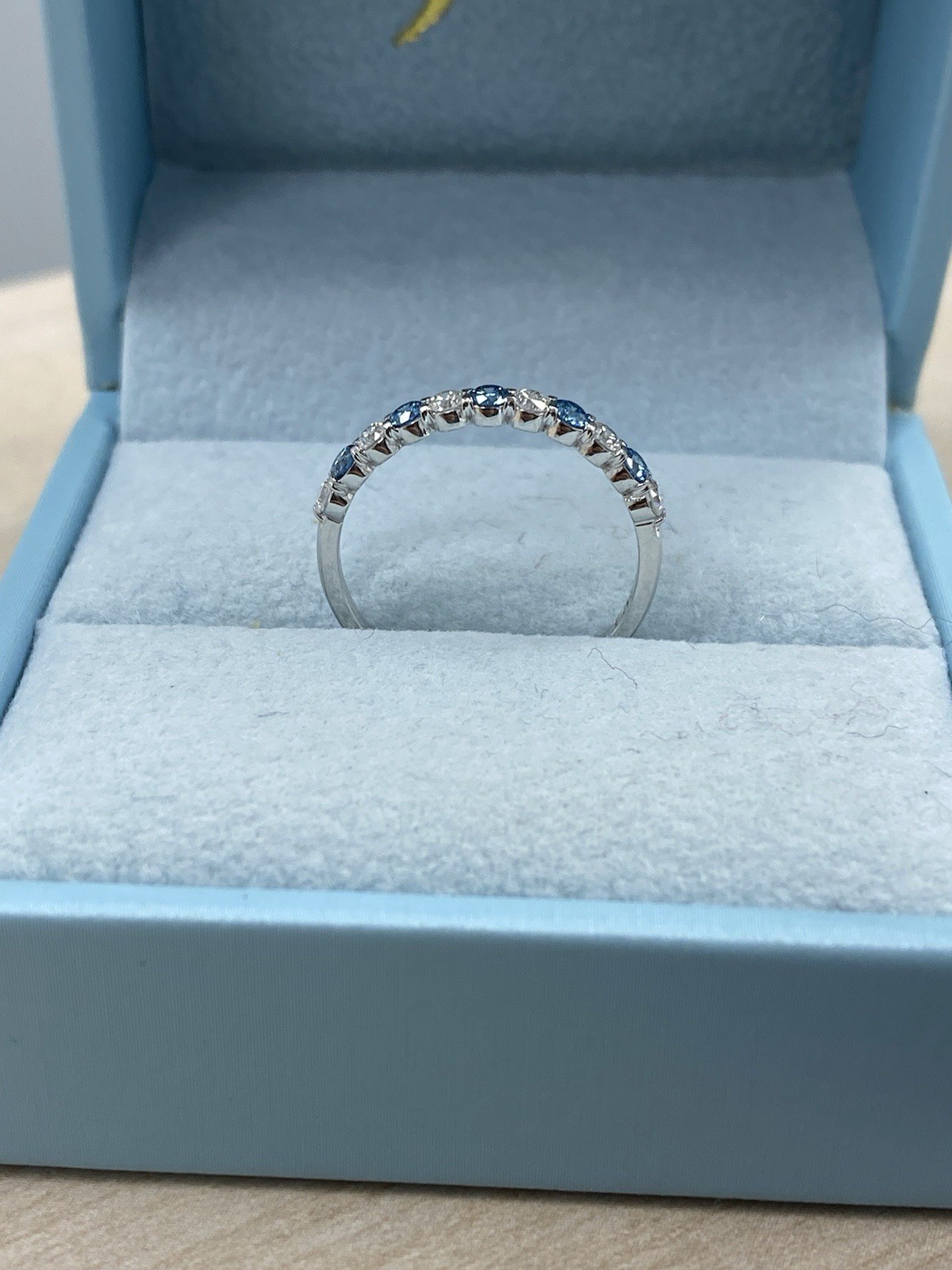 This diamond wedding band is a dazzling expression of love and commitment!! Crafted in stunning 14k white or yellow gold, it features 0.50 carat eleven round brilliant cut lab-grown colorless and blue diamonds, each securely held in a pave setting.