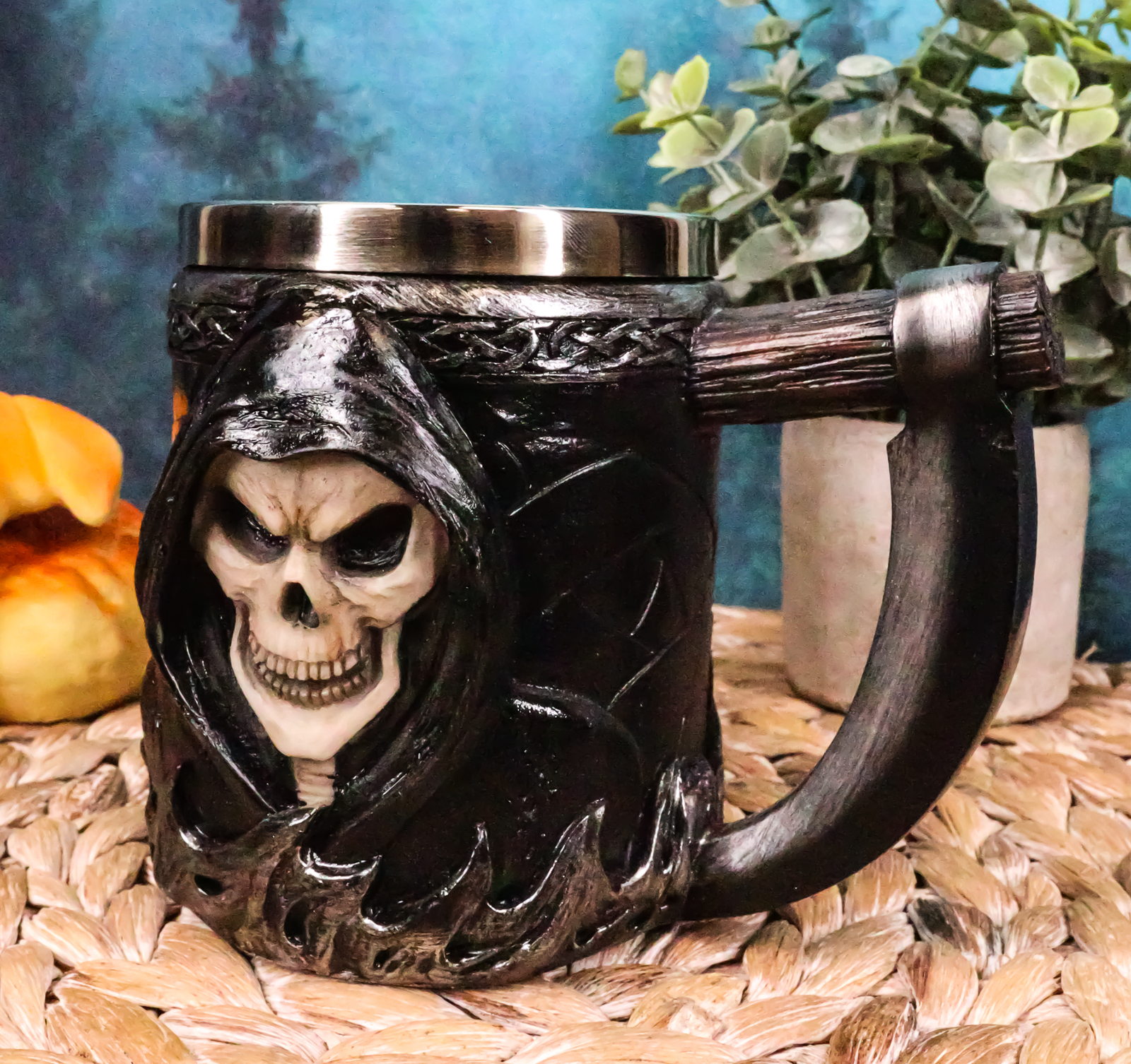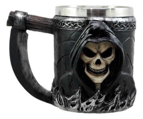? This Grim Reaper Coffee Mug is made of high quality resin with stainless steel liner, individually hand painted and polished. Color Tone May vary from pictures.