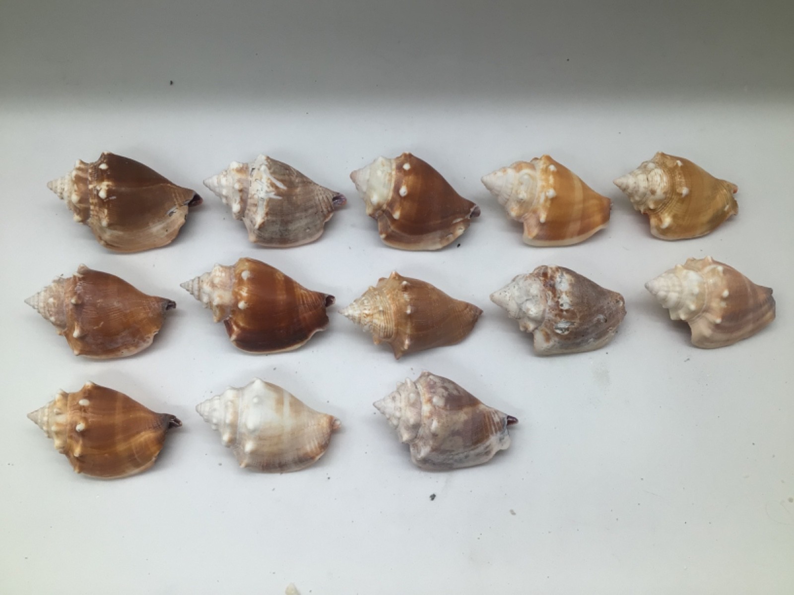 This lot of 14 Florida Fighting Conch seashells was collected from Florida beaches and measures approx. 3 inches each. With spiral ridges and natural cream, tan, and brown tones, they make perfect additions for nautical displays, beach wedding decor, or craft projects.