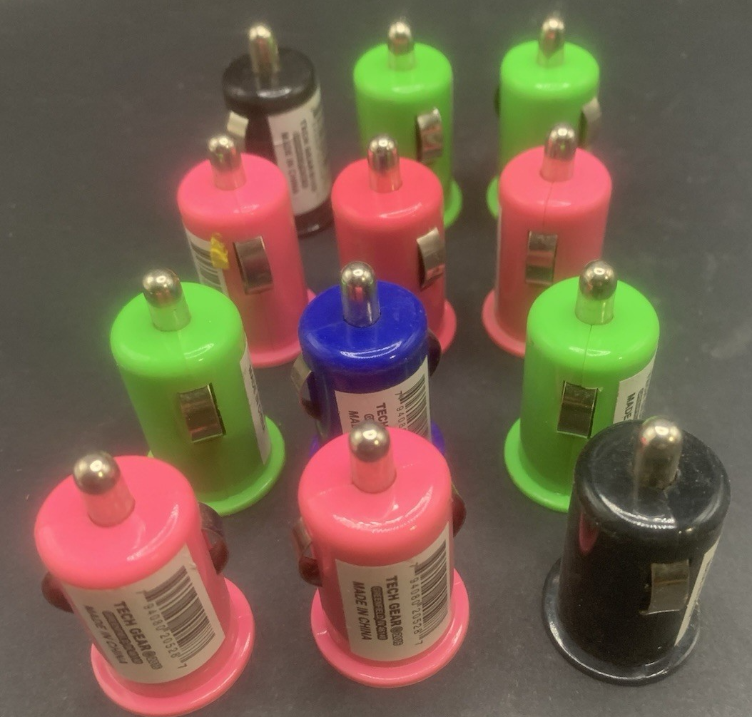 The USB Car Charger by Tech Gear is a versatile charging solution for on-the-go devices. With the option of various colors, users can choose a charger that suits their style. The included USB Wall Charger allows for convenient at-home charging, and the Tech Gear brand ensures reliable performance. Perfect for keeping all your devices powered up and ready to use at any time. Set Includes 12 Tech Gear USB car chargers, 5 Unbranded USB car chargers and six unbranded USB wall chargers 0.05amp. All appear to be new but can not be certain.