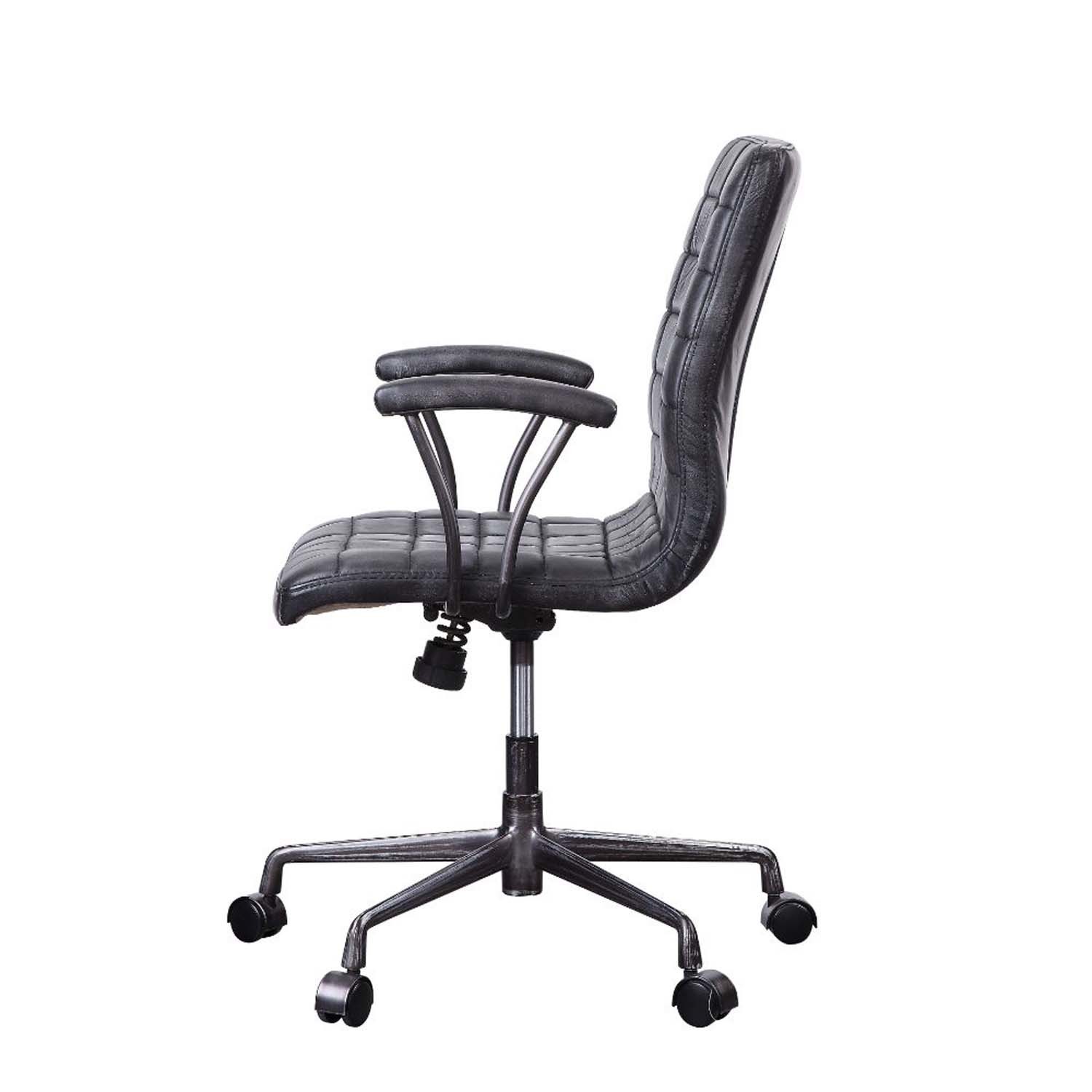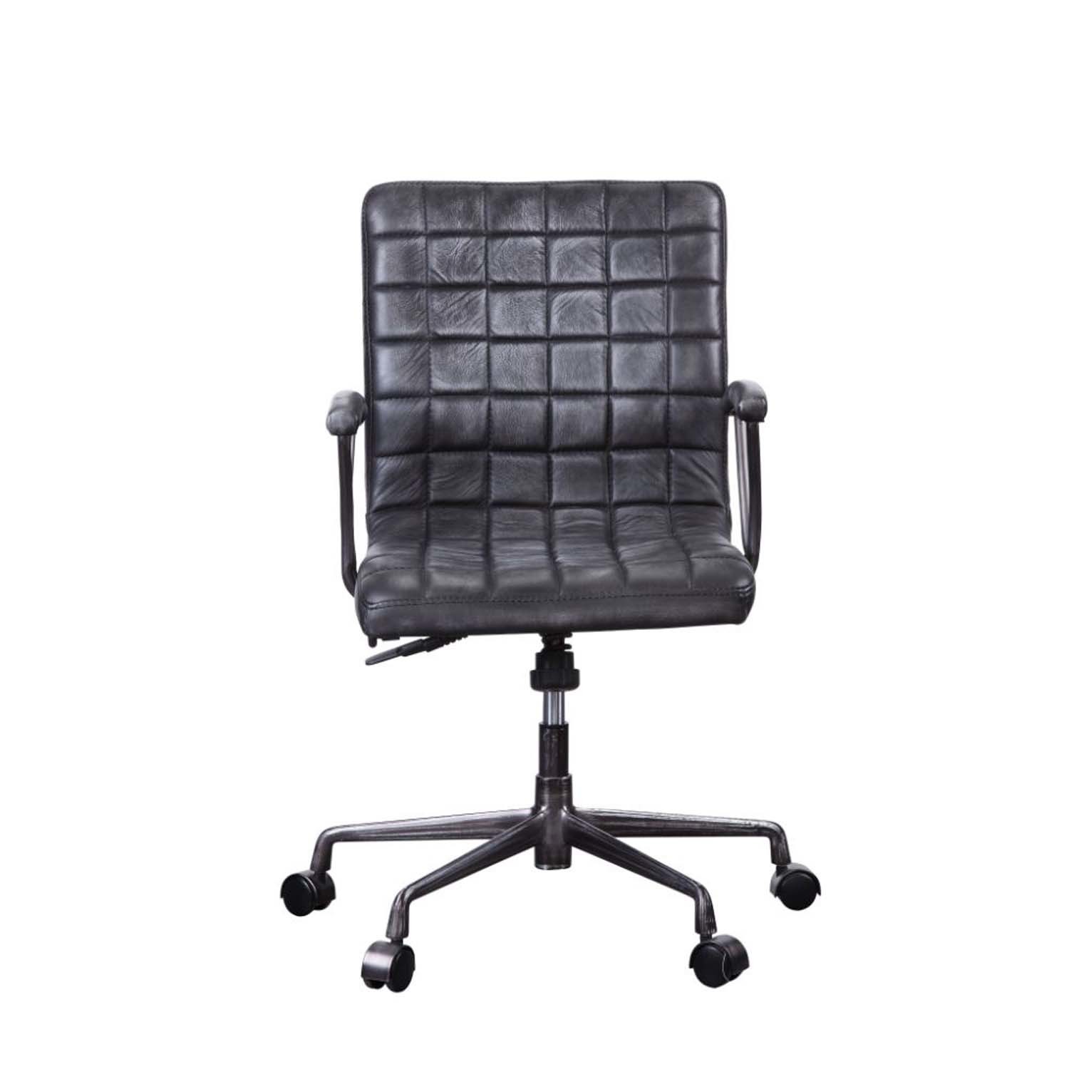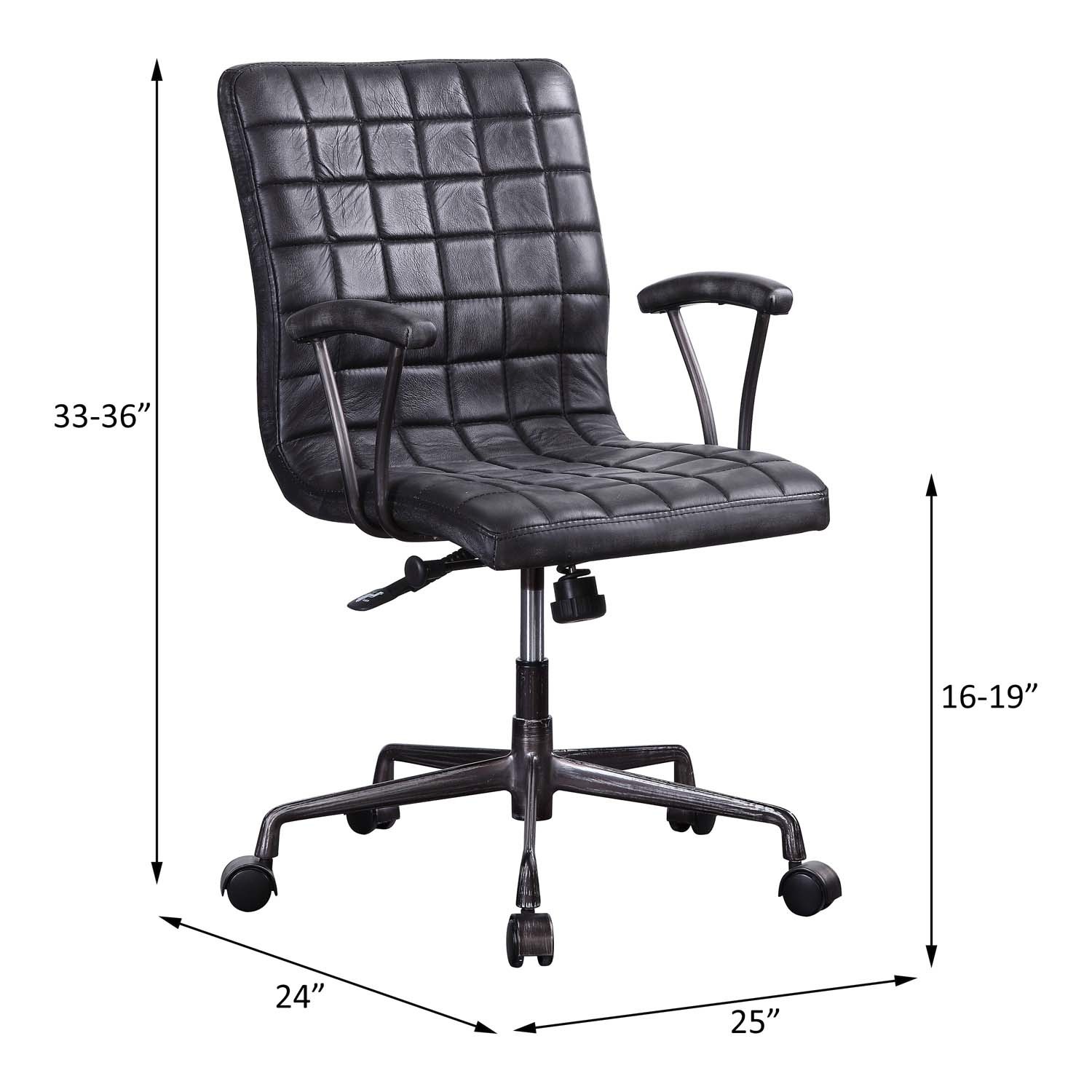 Features: Executive Arm Office Chair (High Back) Seat: Swivel (360 Degrees), Adjustable Height (Pneumatic Lift), Square Shape Padded Seat Back: Top Grain Leather Cushion, Geometric Tufted, Inner Frame: Ply Arm: Padded Top Metal Support Backrest: Padded, 5-Star Base w/Casters: Metal Base, Matte Iron Set Includes: One (1) Office Chair