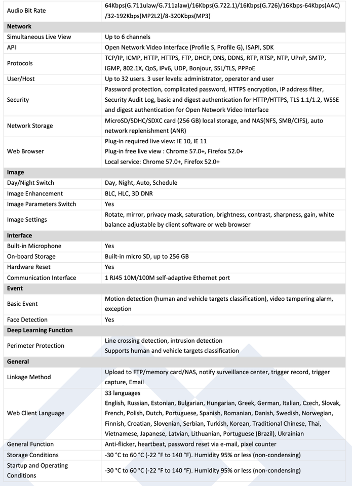 High quality imaging with 4 MP resolution, Clear imaging against strong backlight due to 120 dB WDR technology, Efficient H.265+ compression technology, Built-in microphone for real-time audio security, Water and dust resistant (IP67) and vandal resistant (IK10), Focus on human and vehicle targets classification based on deep learning