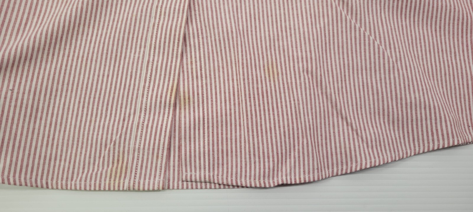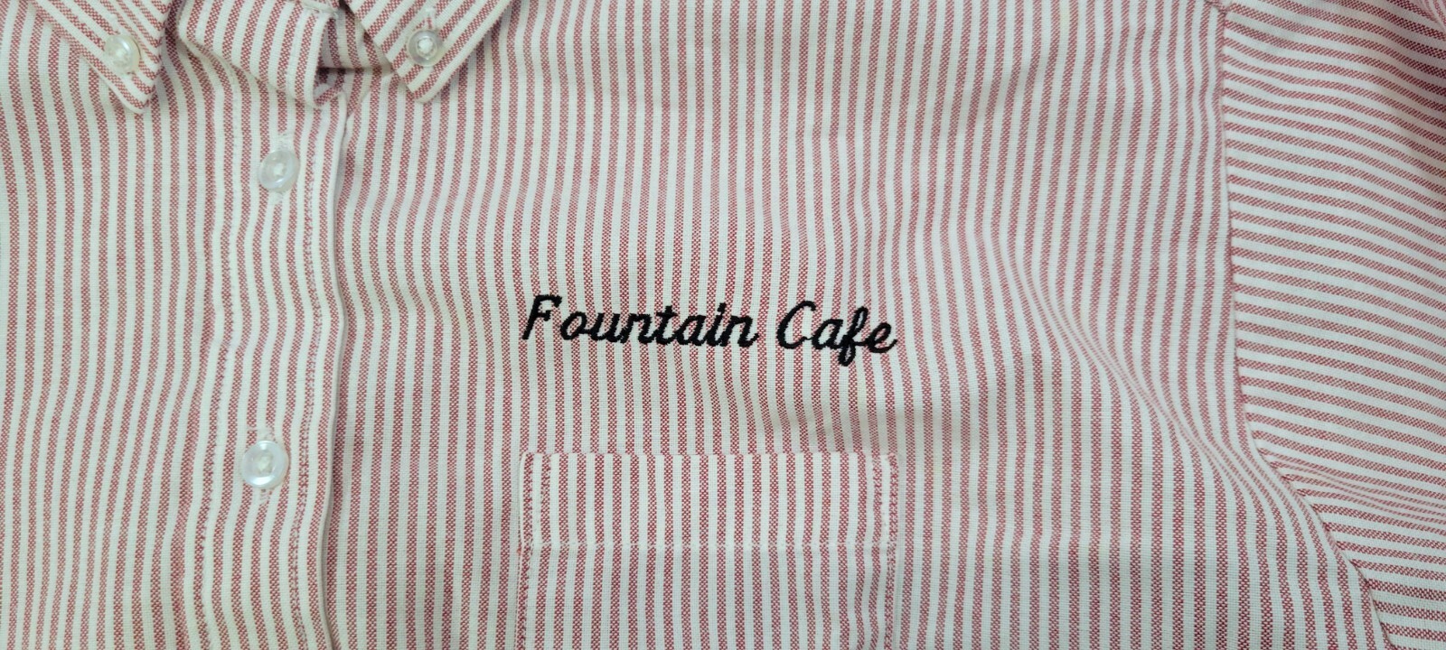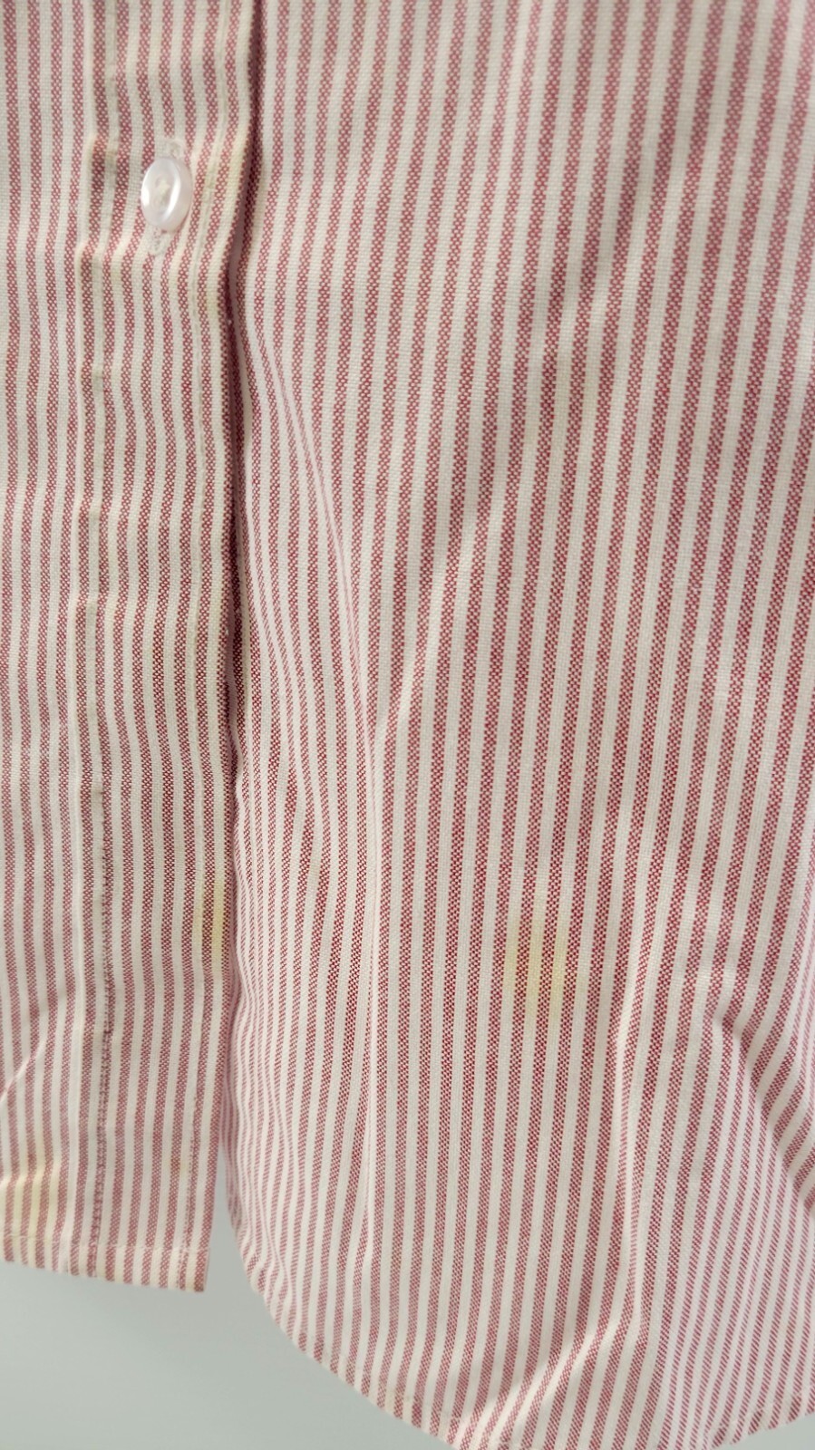 Shirt is a used food service uniform that has some food staining from use but difficult to depict in pictures due to striped design. Other than slight staining, shirt is in overall good condition with life left to it possibly even as a prop or vintage diner costume.