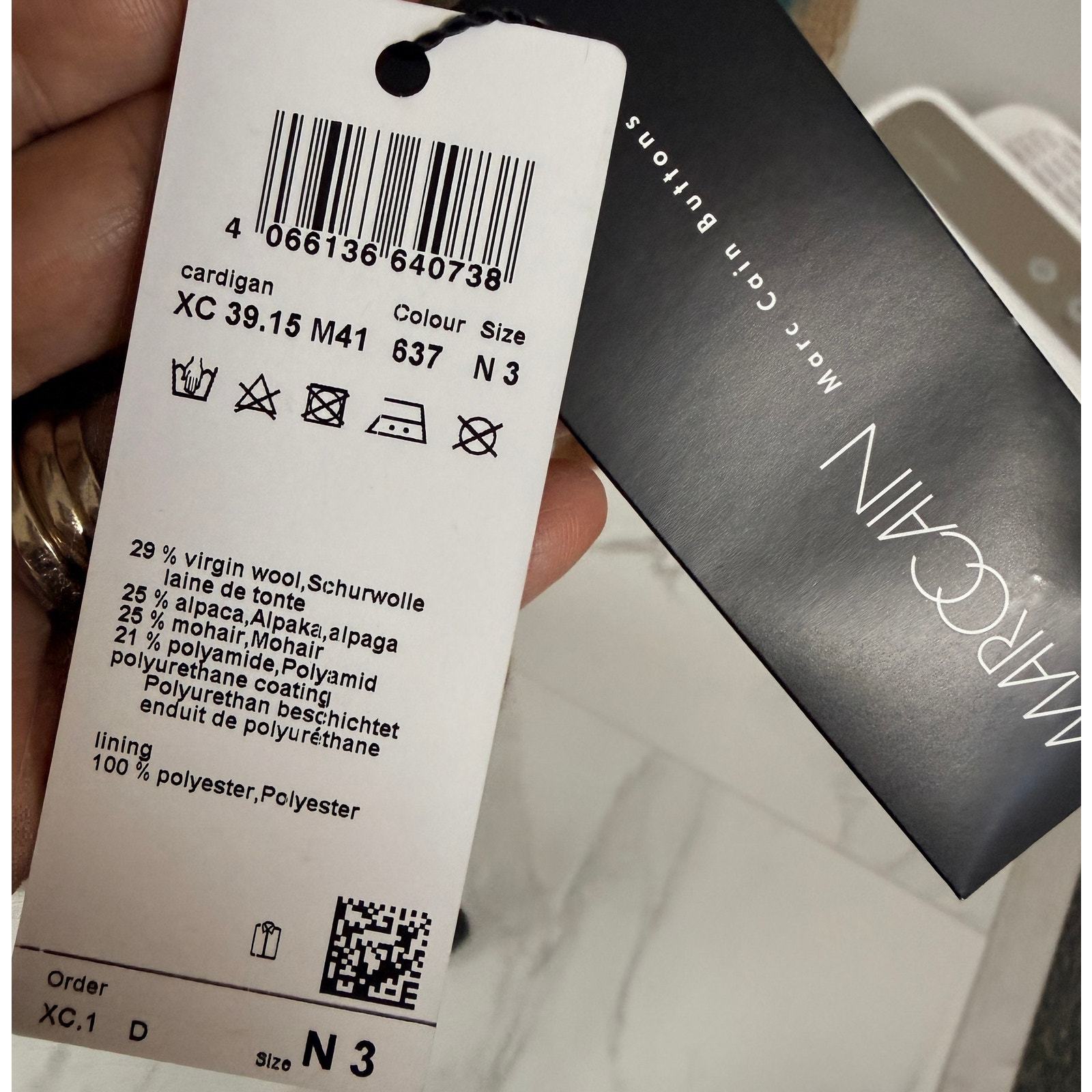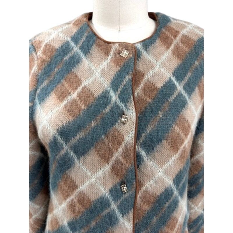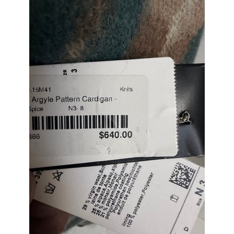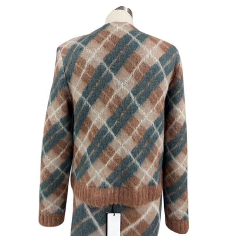 Luxury designer knitwear set from Marc Cain, brand new with tags. Includes a cardigan and matching pencil skirt in an oversized argyle pattern with teal, camel, and cream spice tones. Crafted from a premium wool-alpaca-mohair blend, this ensemble combines modern tailoring with timeless knit luxury.
