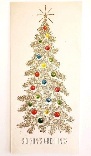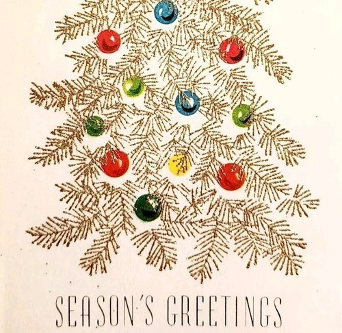 1960-70s Christmas Greeting Card Glitter Xmas Tree Seasons Greetings VTG DWMM3