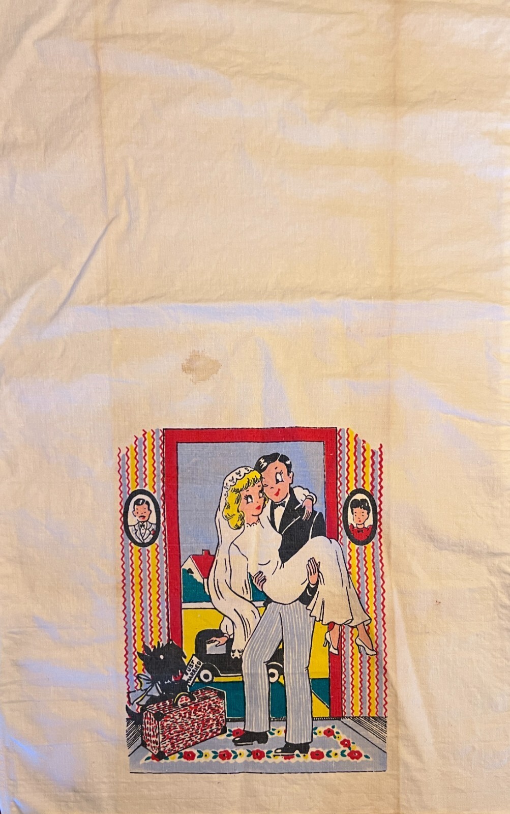 40's 50's Vtg Tea Towel NEWLYWED JUST MARRIED Graphic MCM 15x28"