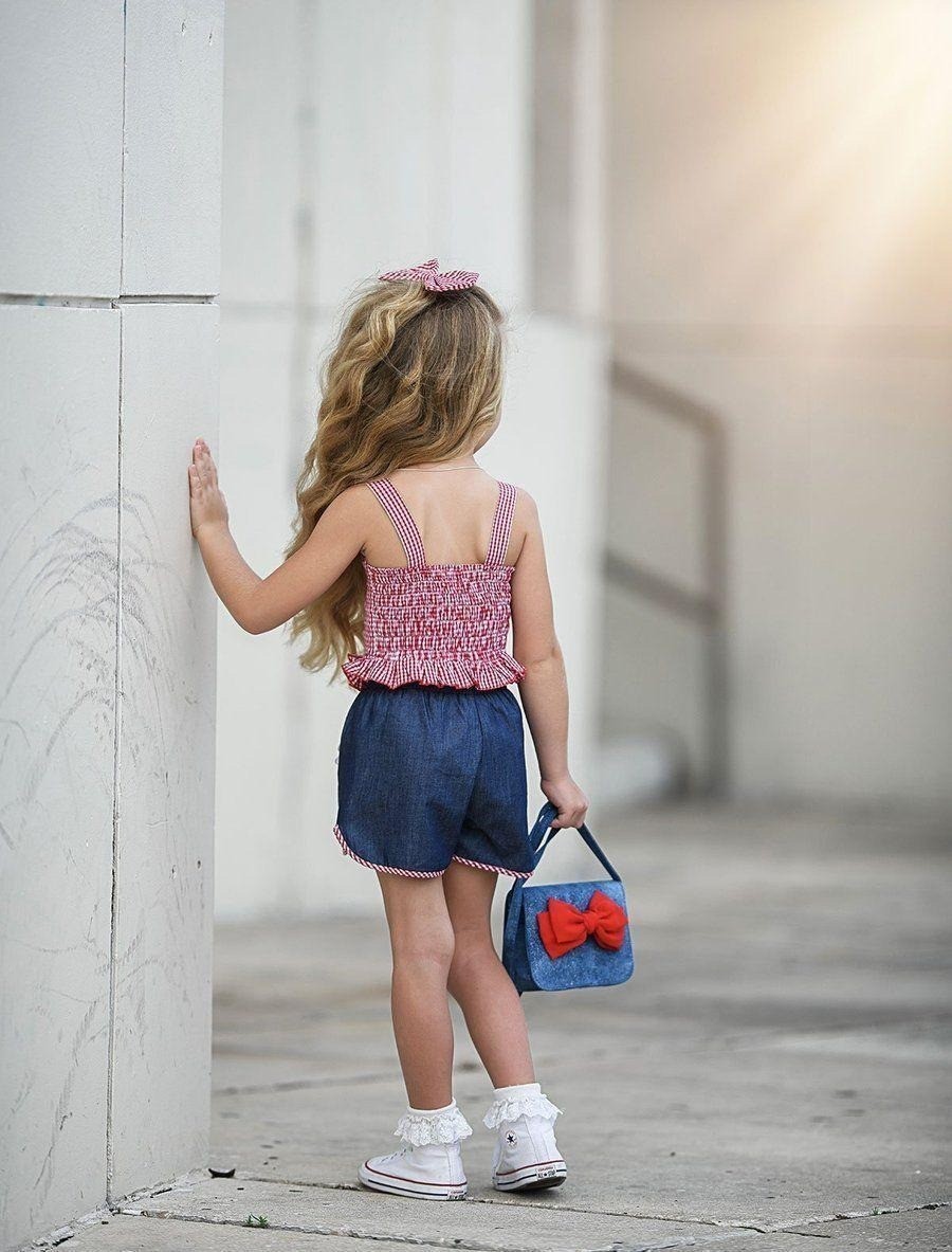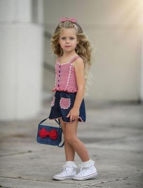 This charming Dollcake outfit features a red gingham top and shorts with a matching hair bow, perfect for playful outdoor adventures. Ideal for picnics and sunny days, this set offers both style and comfort for your little one.