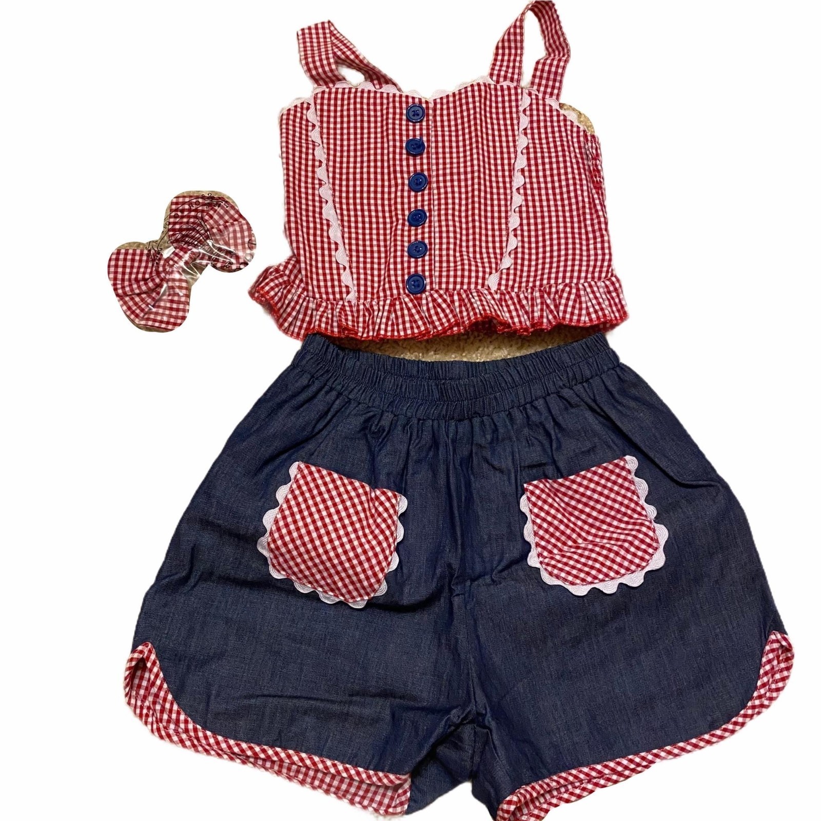 Dollcake Picnic in the Park Sz 6 Red Gingham Top & Shorts Outfit w/ Hair Bow NWO
