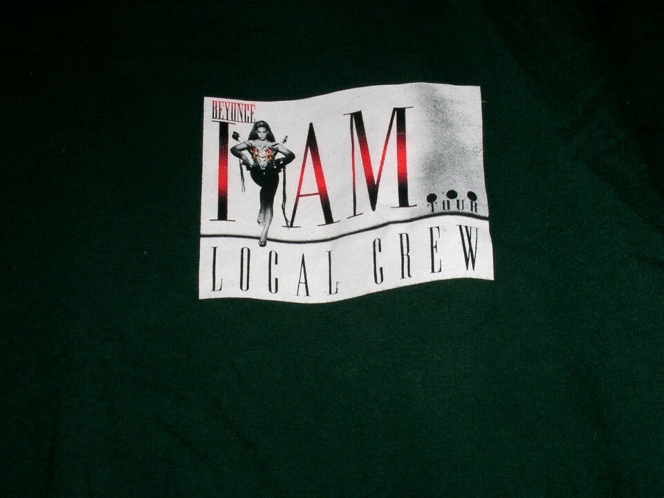 This is a vintage concert tour t shirt entitled, "Beyonce I Am Tour Local Crew". Tag reads: Jerzees Z Heavyweight Cotton. There is no back printing. Color is Hunter Green. A terrific item for the fan or collector.