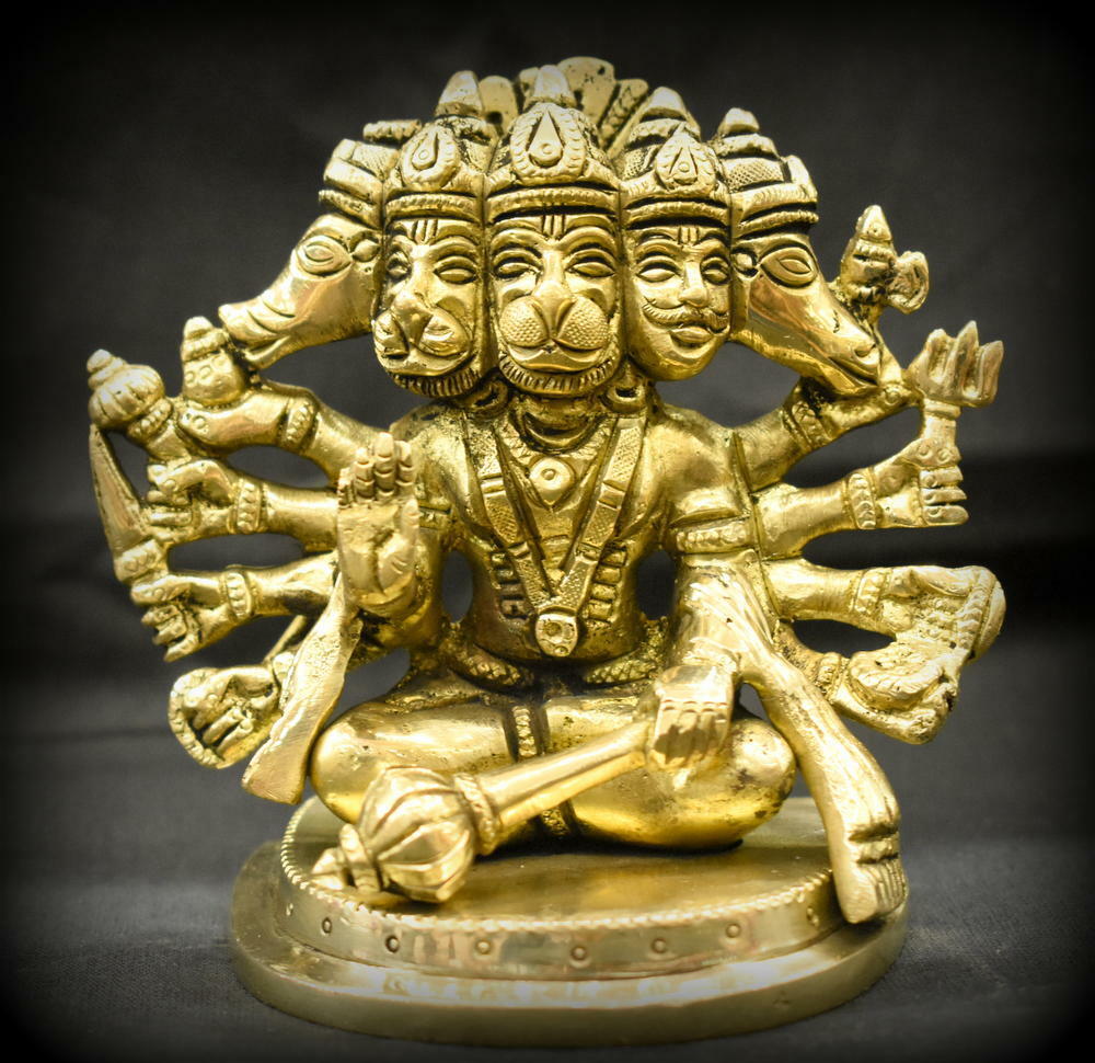 Dimension : Panchmukhi Hanuman is Made in heavy shining brass in sitting position . He is having 10 hands holding weapons to assure protection to his devotees from all danger and evil . The five heads represent the Hayagriva , Narsimha , Garuda , Varaha , Hanuman . It is said that