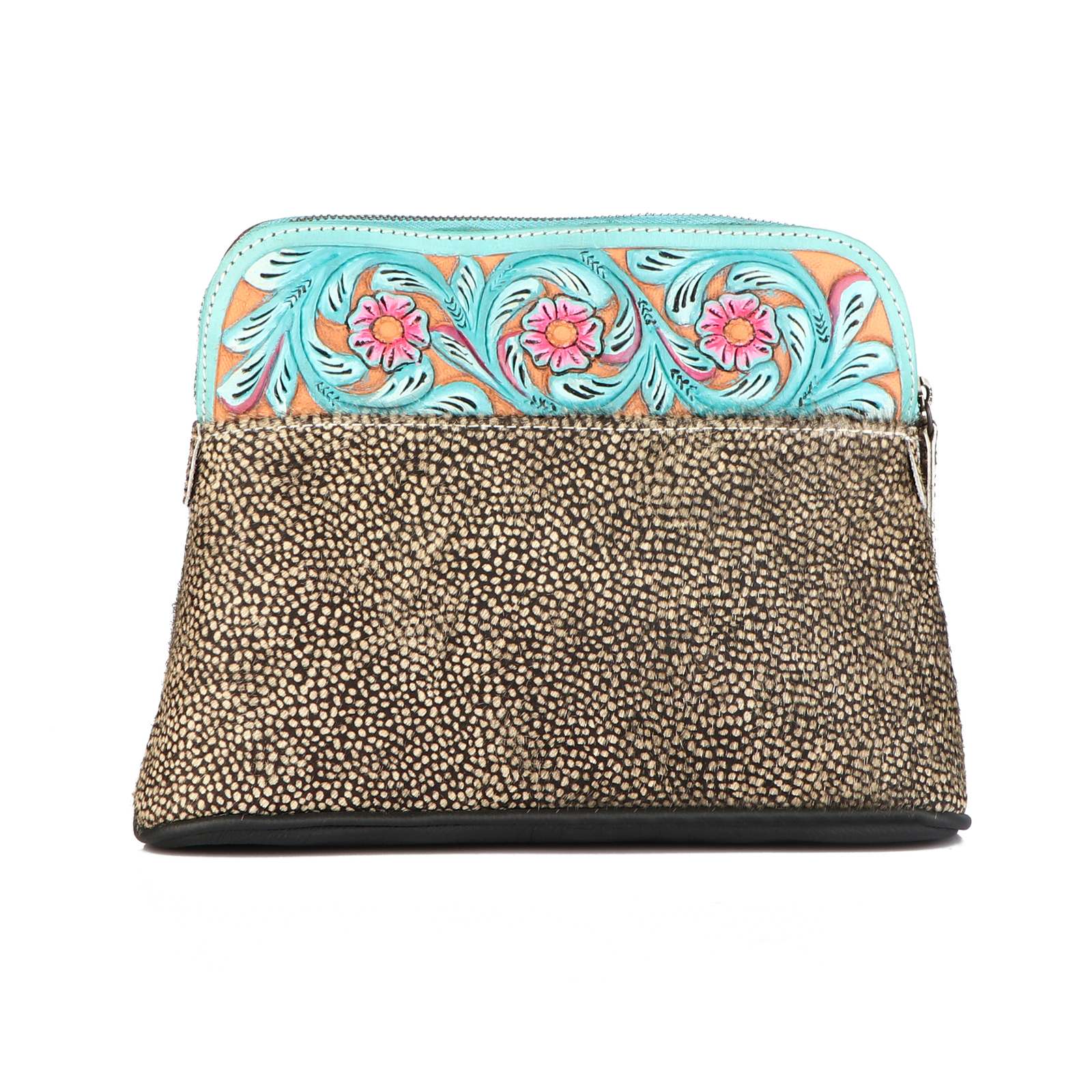 Women Printed Hair-on Floral Tooled Leather Zippered Makeup Cosmetic Bag