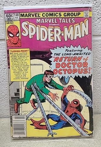 Marvel Tales #148 - 1982 - Spiderman Return Of Doctor Octopus Comic Book Comics. This vintage comic book is perfect for collectors and fans of the Spider-Man series. Featuring Doctor Octopus as the main antagonist, this issue is from the Bronze Age (1970-83) and published by Marvel.