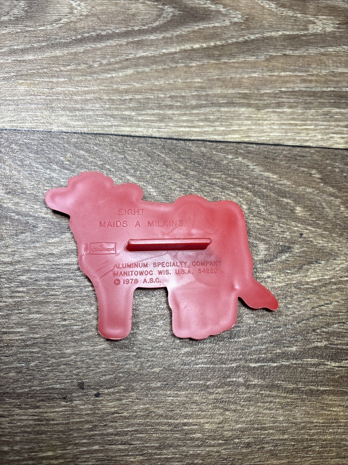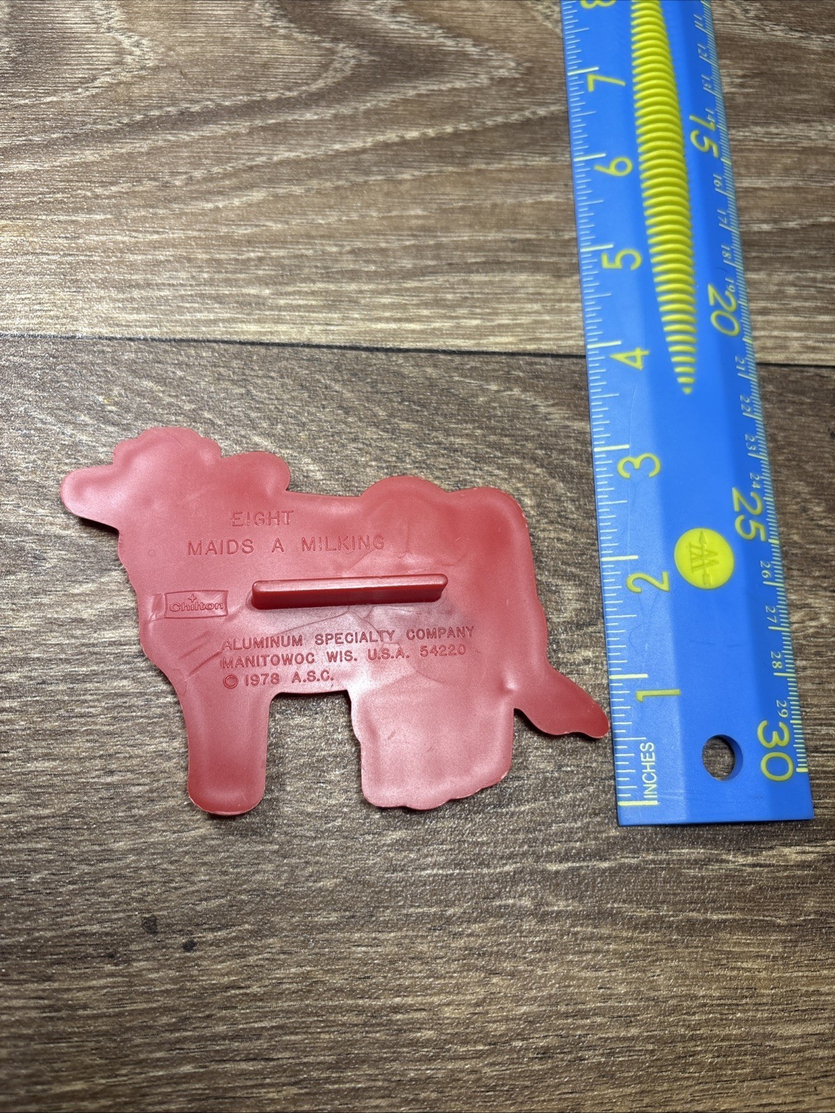 The Chilton 12 Days of Christmas Eight Maids A Milking Cookie Cutter from 1978 is a vintage collectible perfect for adding a nostalgic touch to your holiday baking. This red cookie cutter features a unique design inspired by the classic Christmas carol, making it a fun and festive addition to your kitchen decor. With its retro charm and sturdy construction, this Chilton cookie cutter is sure to become a cherished part of your baking traditions for years to come.