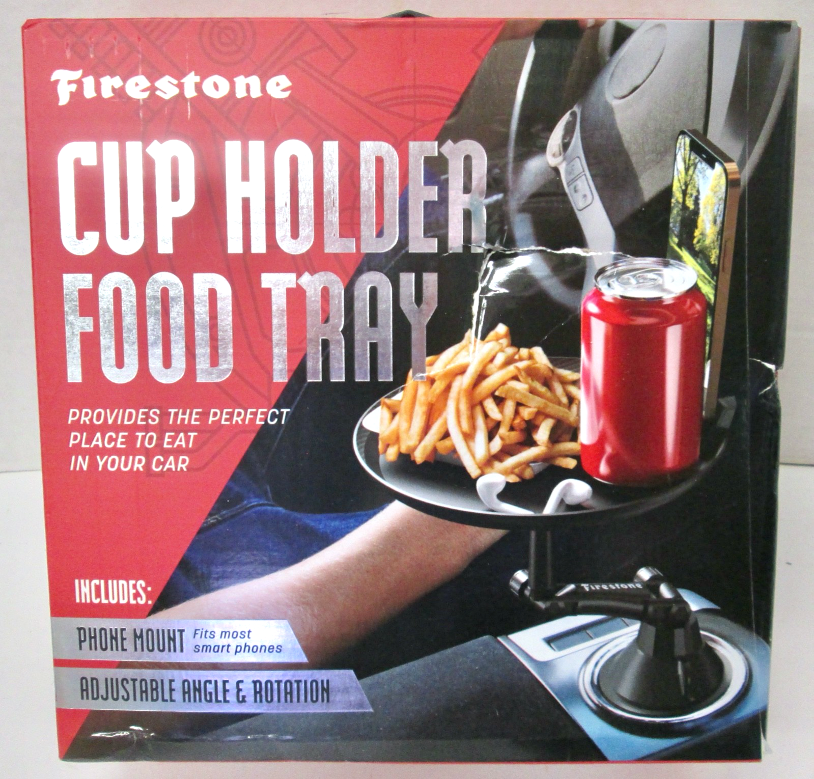 Firestone Car Cup Holder Tray Table For Eating With Cell Phone Slot/Stand. The tray is still sealed but has a small tear in the front of the package. Sold with free shipping.