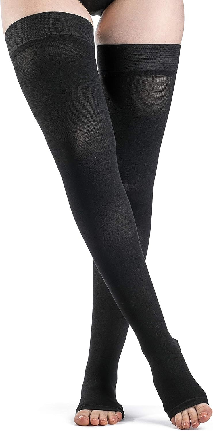 ? BEST SUITED FOR: With 30-40 mmHg of support, these open toe compression thigh highs are great for entry level compression, is suitable for post vein procedure, frequent travelers, and to relieve various types of edema.