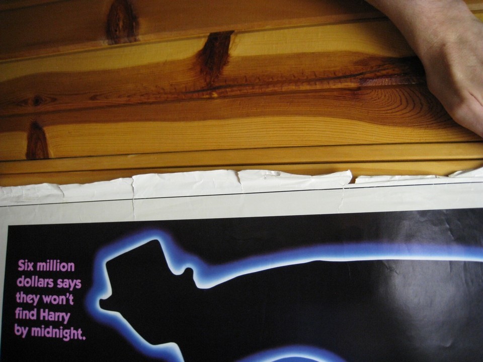 This poster is 27 inches by 41 inches approximately. It is not in mint condition. It has edge dings, creases, top edge ruffling with two rips. The poster will be shipped rolled in a hard cardboard tube. Folders