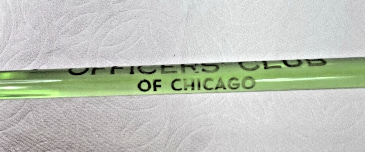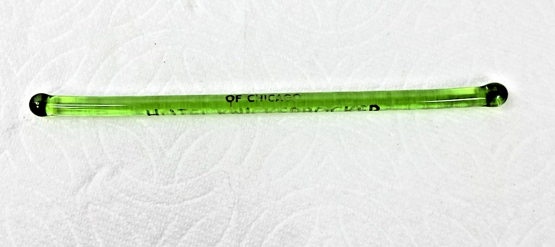 Antique Hotel Knickerbocker Chicago Officers Club Light Green Glass Swizzle Stick 6" In good shape but man the lettering is impossible to get a photo of