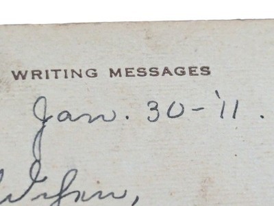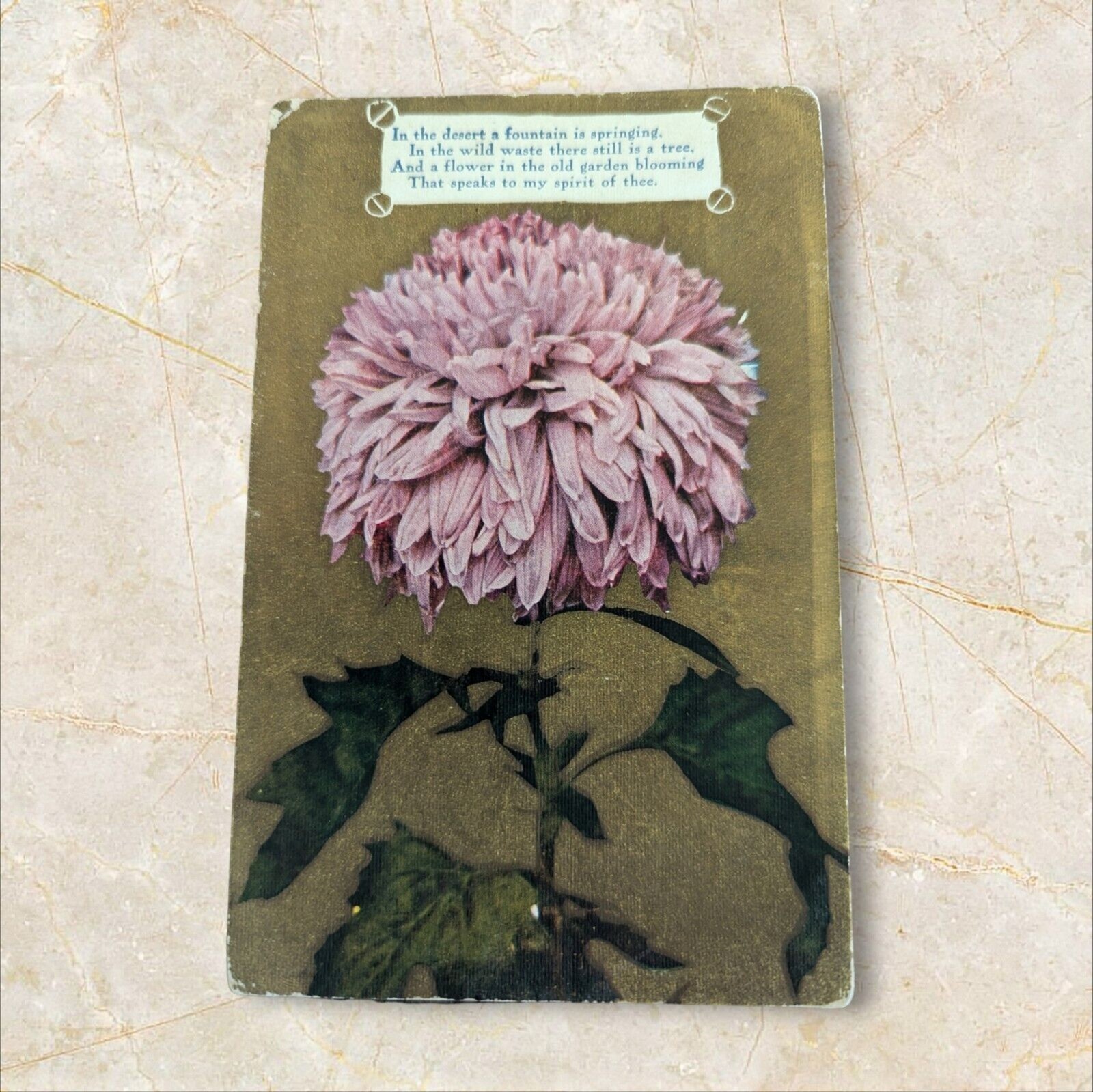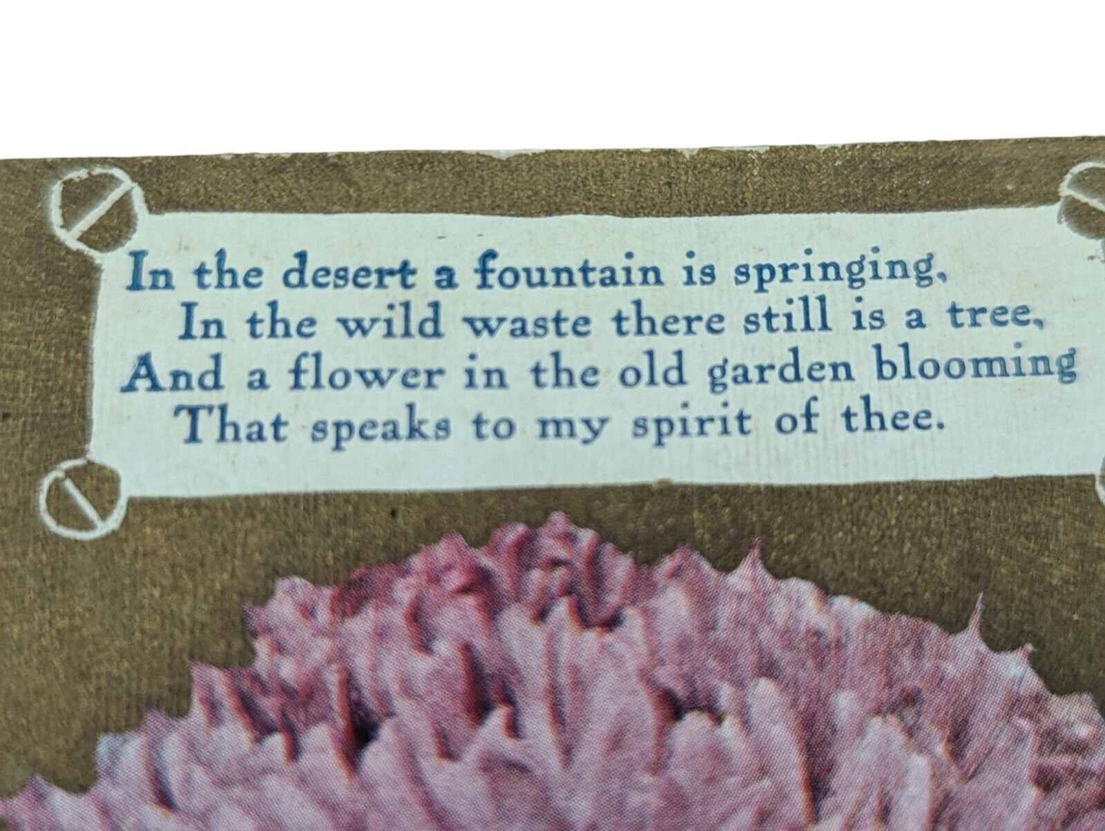 This antique postcard features a beautiful purple flower design with a poem and is signed by Mama. The postcard is a standard size (5.5 x 3.5 inches) and is made of cardboard material. It was manufactured in 1911 in Lehigh, Kansas, and is an original printed lithograph.