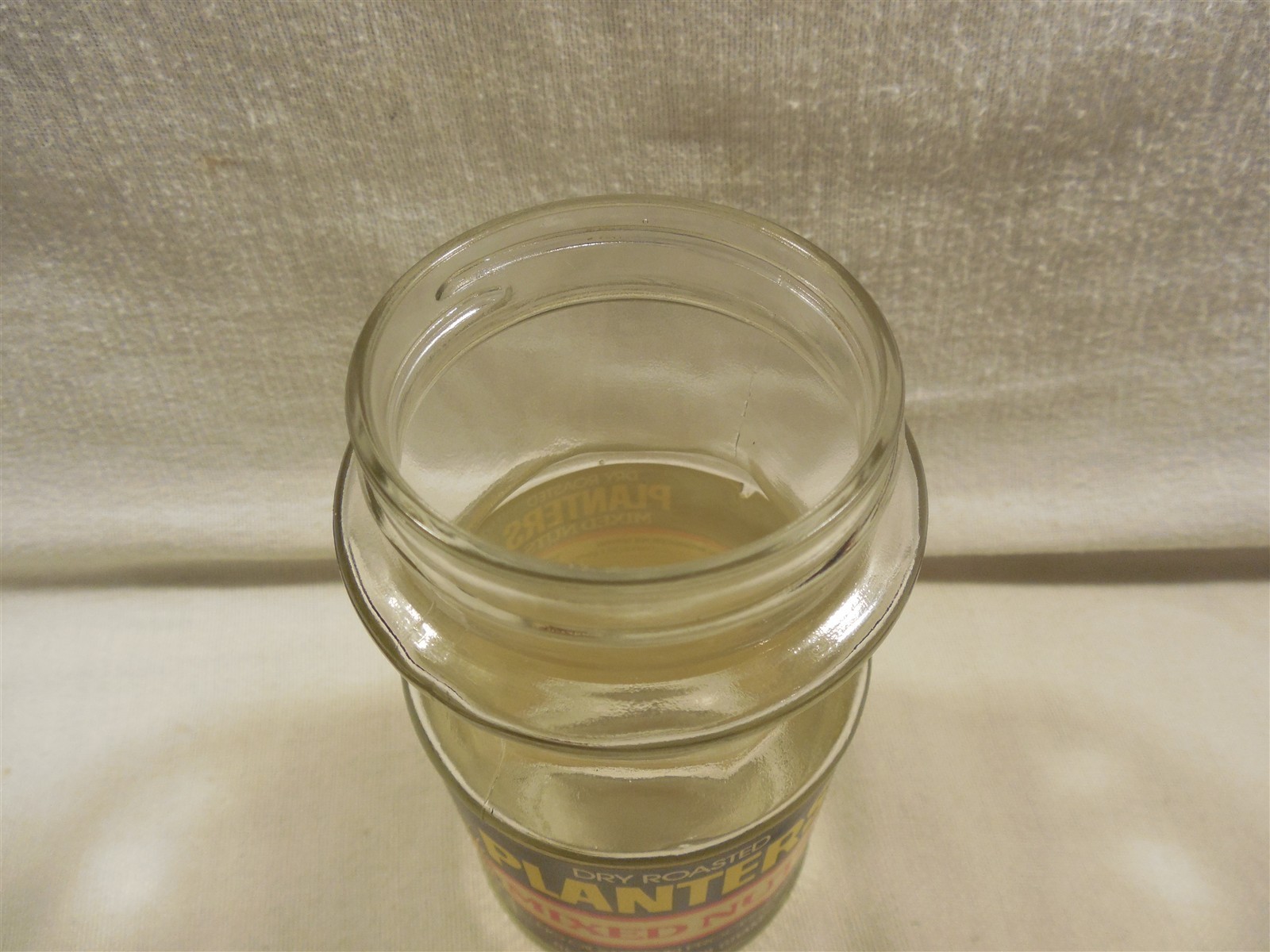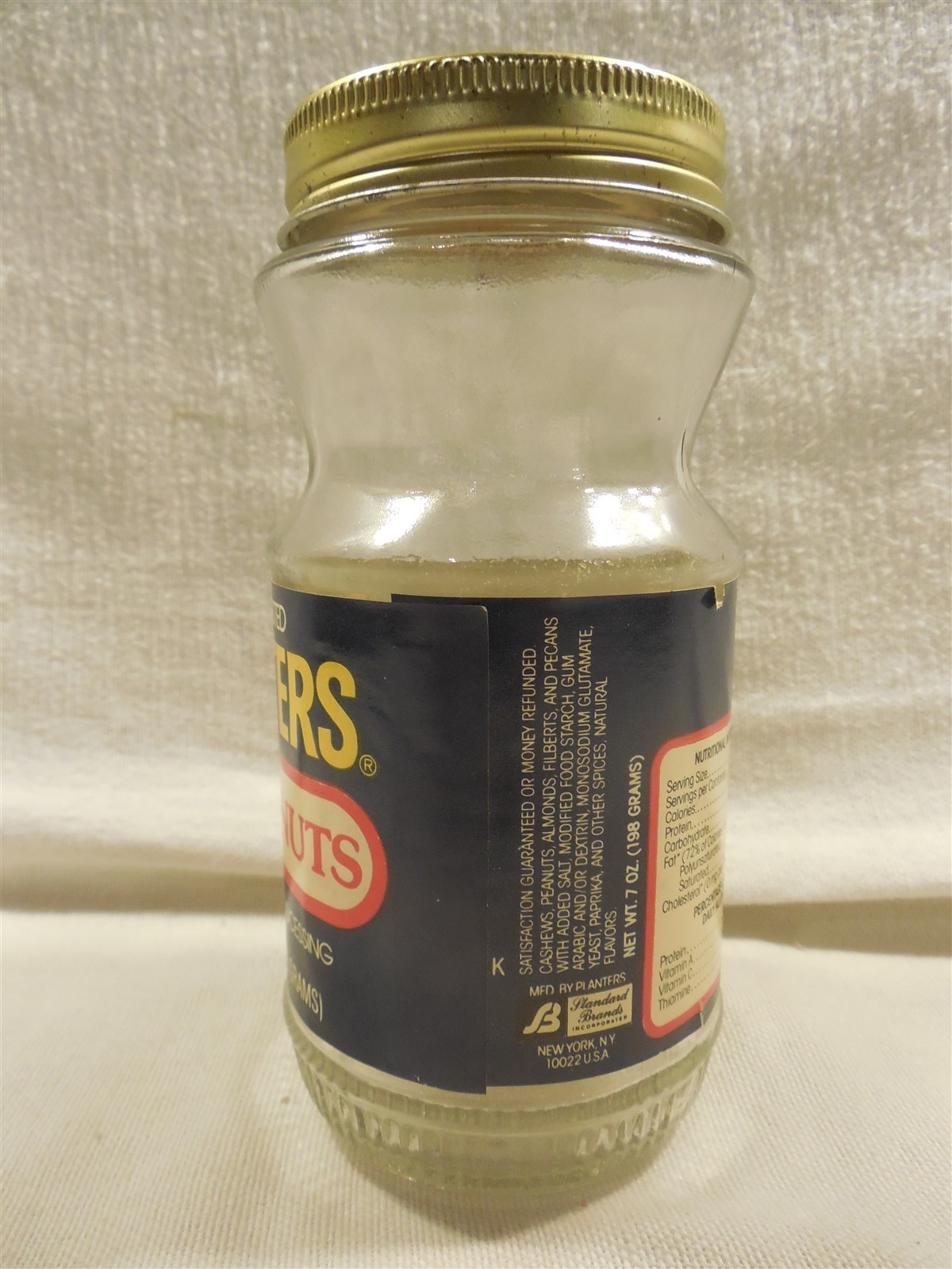 Near Mint empty Planters Peanut Mr. Peanut mixed nuts product jar has no chips or crakcs. Label colors are strong with no fading or stains - 2 tiny tears to the label on the back. Metal lid has no rust or dents. Nice clean Planters Peanut mixed nuts 7 ounce product jar that displays absolutely great when sitting on a shelf!