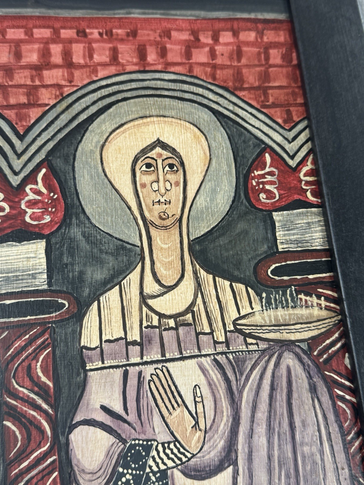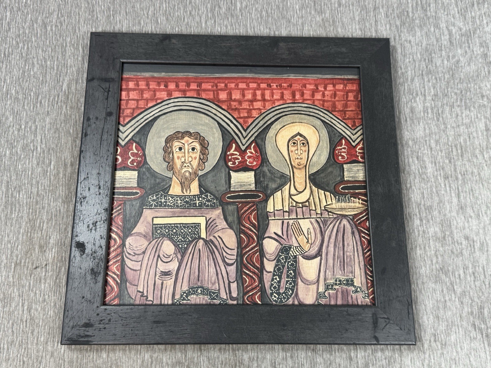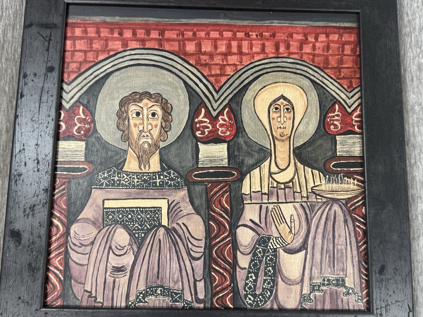 For sale is an original painting inspired by the fresco at Sant Climent de Taรผll featuring Virgin Mary with the Holy Grail and St. Bartholomew. Interesting piece, probably one of a kind. I can find no other examples of this artwork. Hand painted on wood panel.