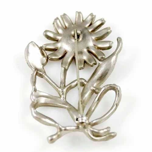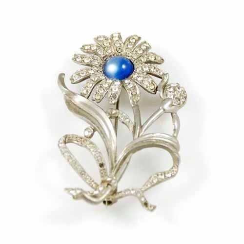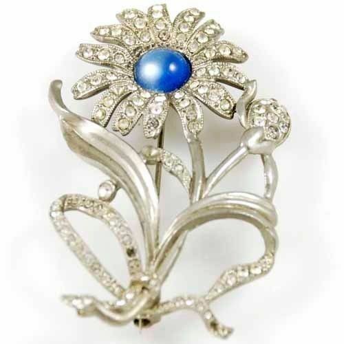 Vintage Silvertone daisy brooch with a blue cabochon center and rhinestone accents measures 1 3?4? x 2 1?2?. There are four rhinestones missing, otherwise excellent condition. 1930s era.
