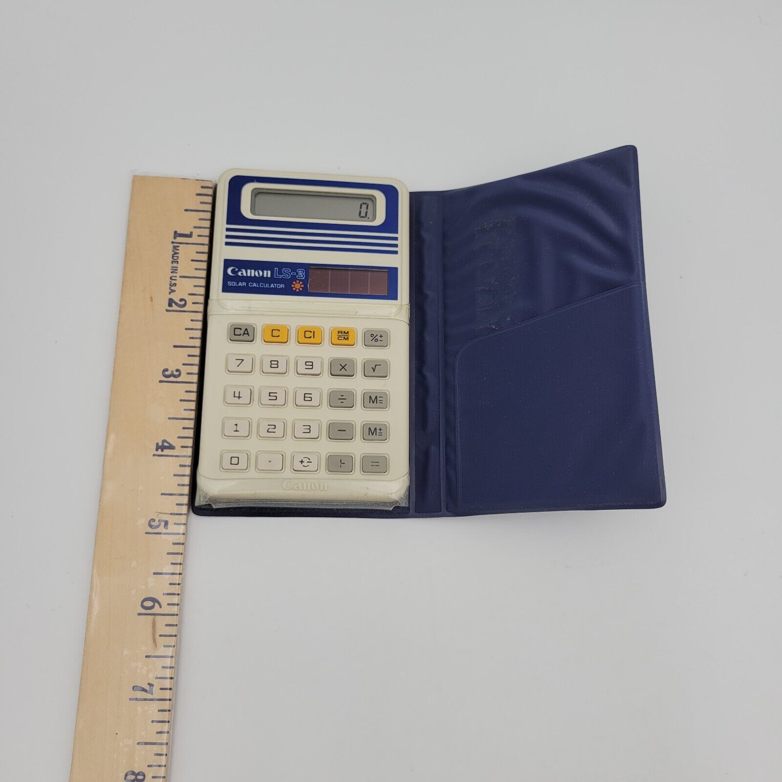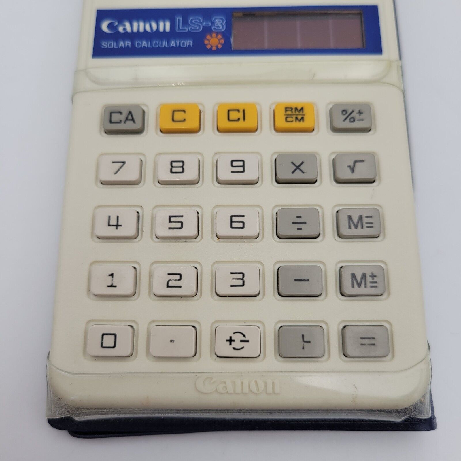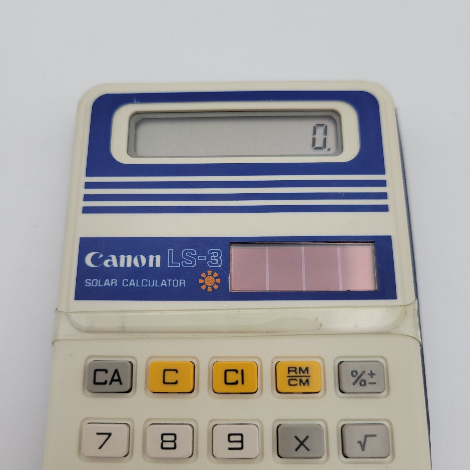 This Canon LS-3 Solar calculator is a vintage electronic handheld device that has been tested and confirmed to be in working order. It was manufactured in Japan and is made by Canon. The calculator comes in a case and is a great addition to any collection of vintage electronics. The calculator is designed for basic arithmetic operations and is powered by sunlight. The device has not been modified and is in its original state. The calculator is being sold in the categories of consumer electronics, vintage electronics, and vintage calculators.