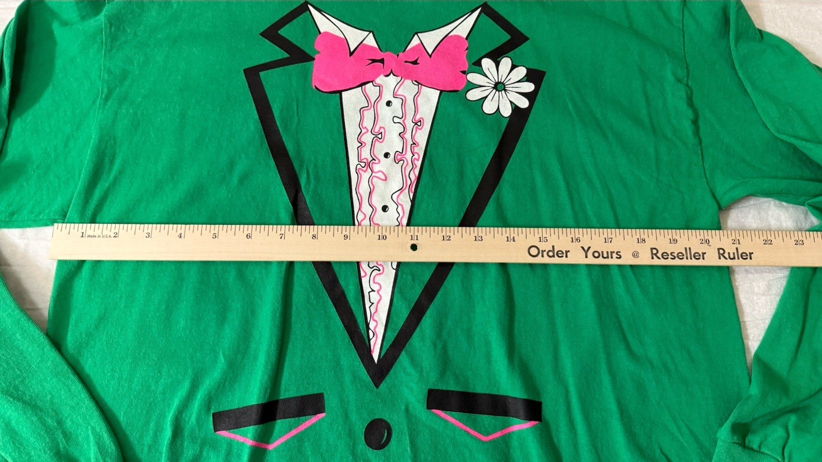 This Men's Tuxedo Shirt Bow tie Long Sleeve T-Shirt in green is perfect for a unique and fun outfit. Made from 100% cotton with a crew neck and regular fit, this shirt features a solid pattern and a graphic tee style. It is designed for a size L and is suitable for both men and women. Whether you're looking for a wedding-themed shirt or a festive outfit for the holidays, this shirt is sure to make a statement. Made in the United States, it is a high-quality addition to any wardrobe.