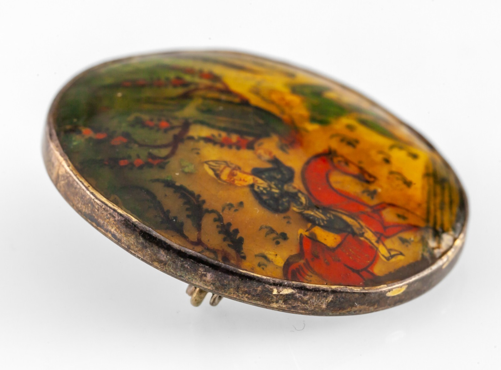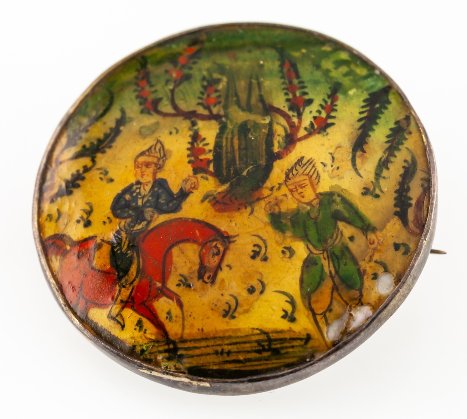 Persische Bemalte Brosche Auf Silberner Rückseite Auf Perlmutt