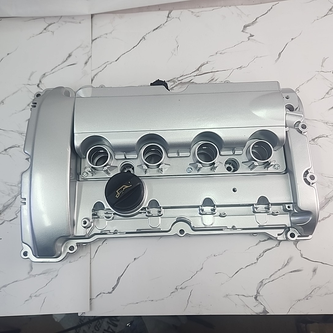 The product is an aluminum valve cover with gasket designed to fit Mini Cooper JCW R55 R56 R59 1.6L engines. The valve cover comes in a silver color and includes an oil filler cap. It is a performance part manufactured in China, featuring an aluminum finish. The product is a genuine OE/OEM part number 11127646555, with interchange part numbers 11127561714, 11127572854, and V202178. It is a high-quality component that helps enhance the valvetrain system's performance.